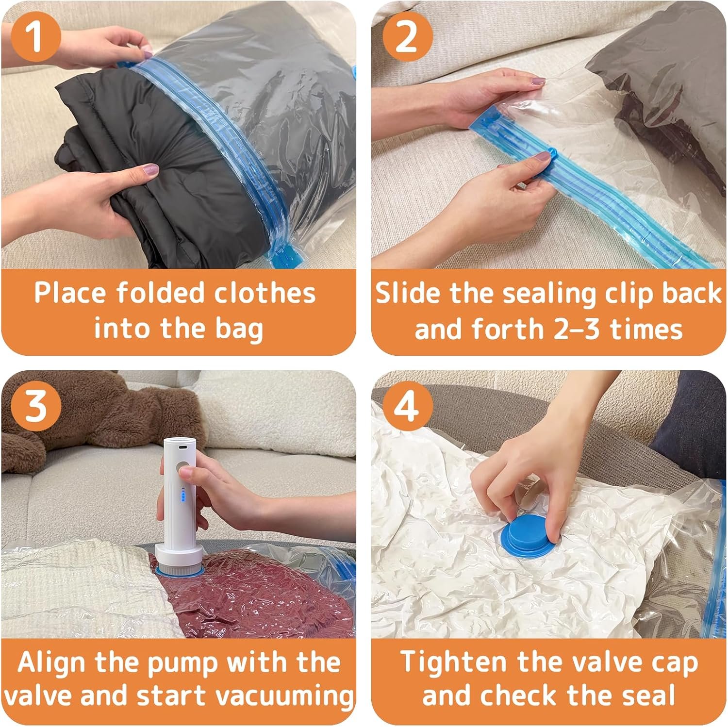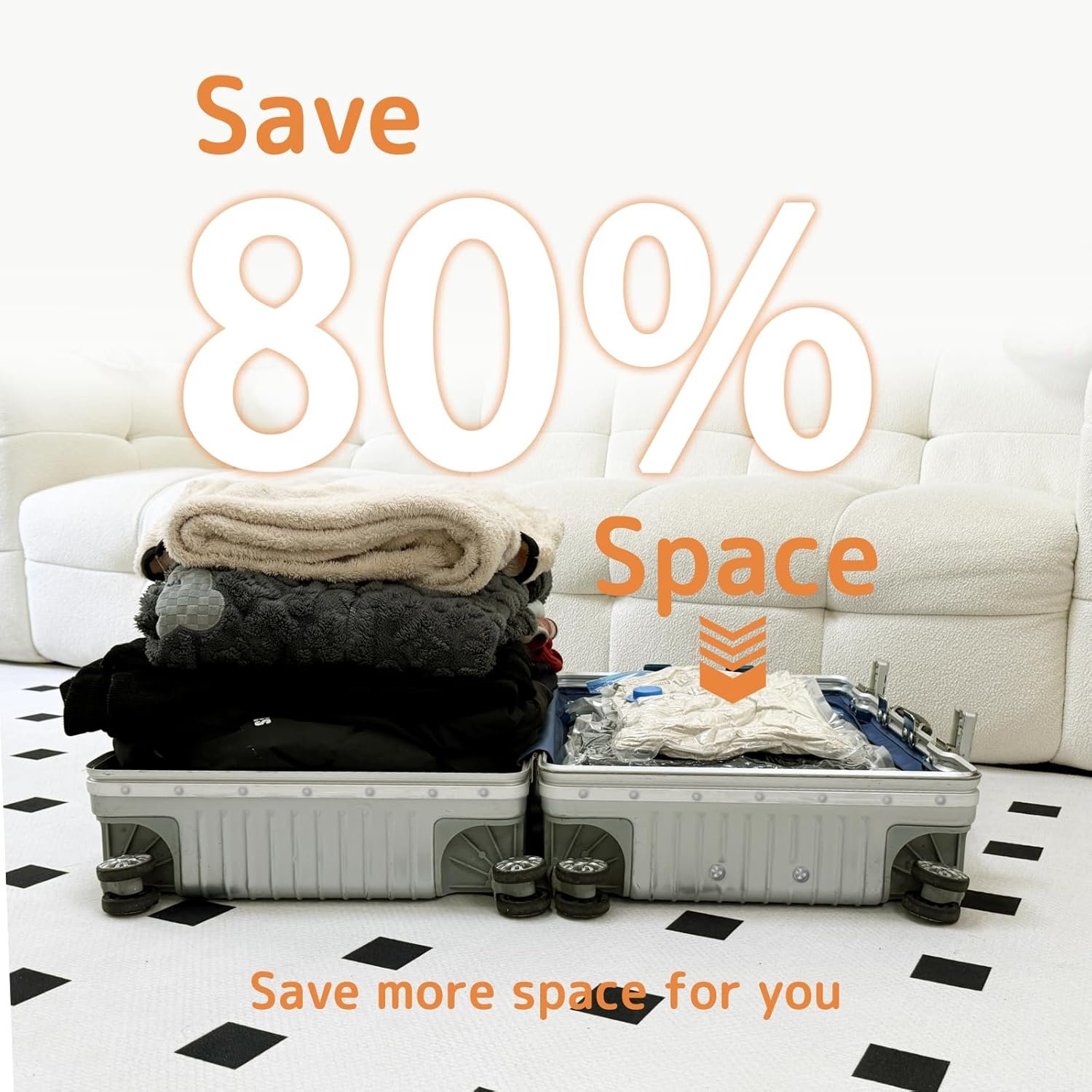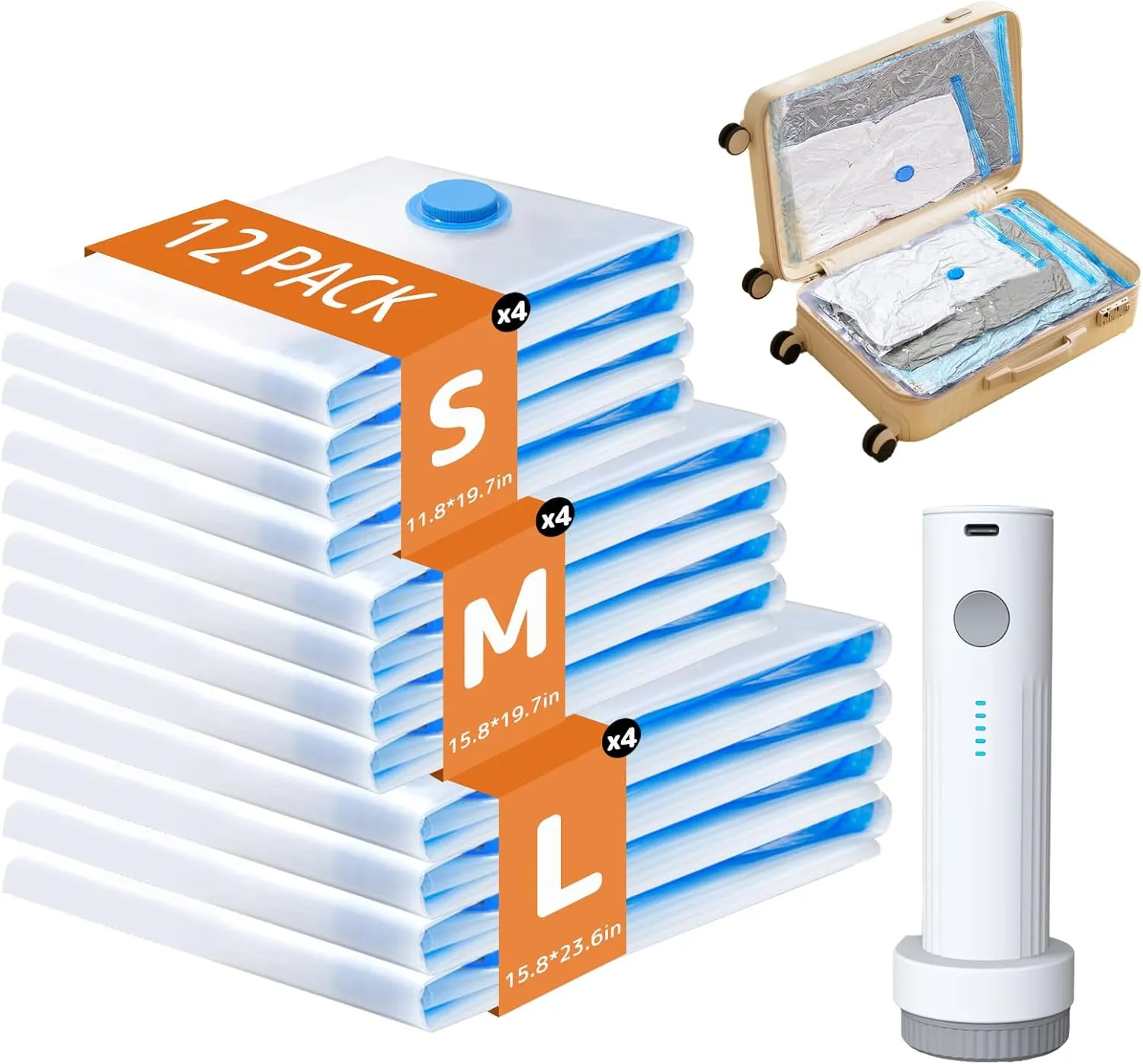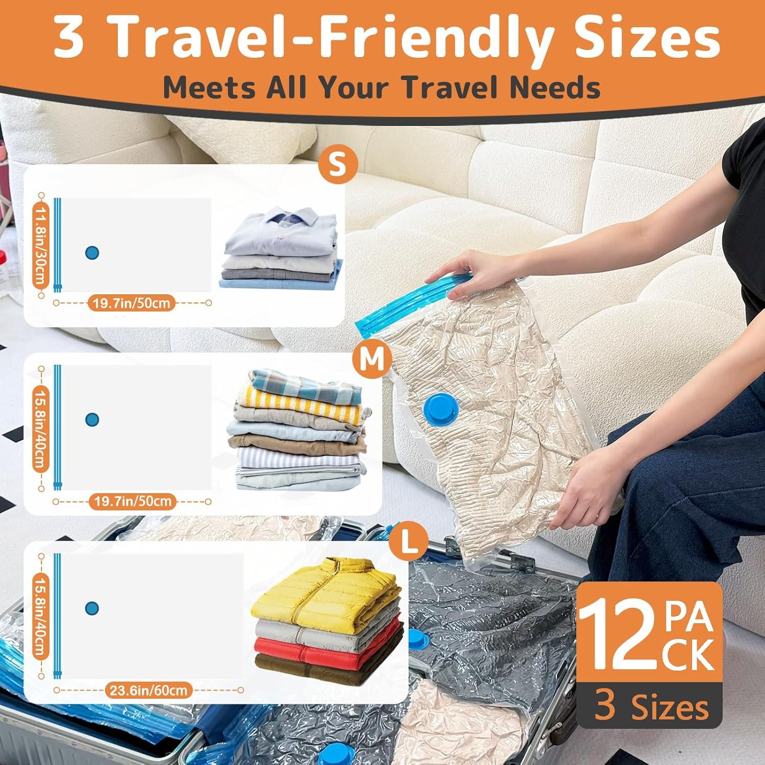 Designed For Travel: Includes 12 vacuum bags in 3 sizes (11.8×19.7in, 15.8×19.7in, 15.8×23.6in) to suit every need – perfect for backpackers, students, or families needing extra suitcase space
