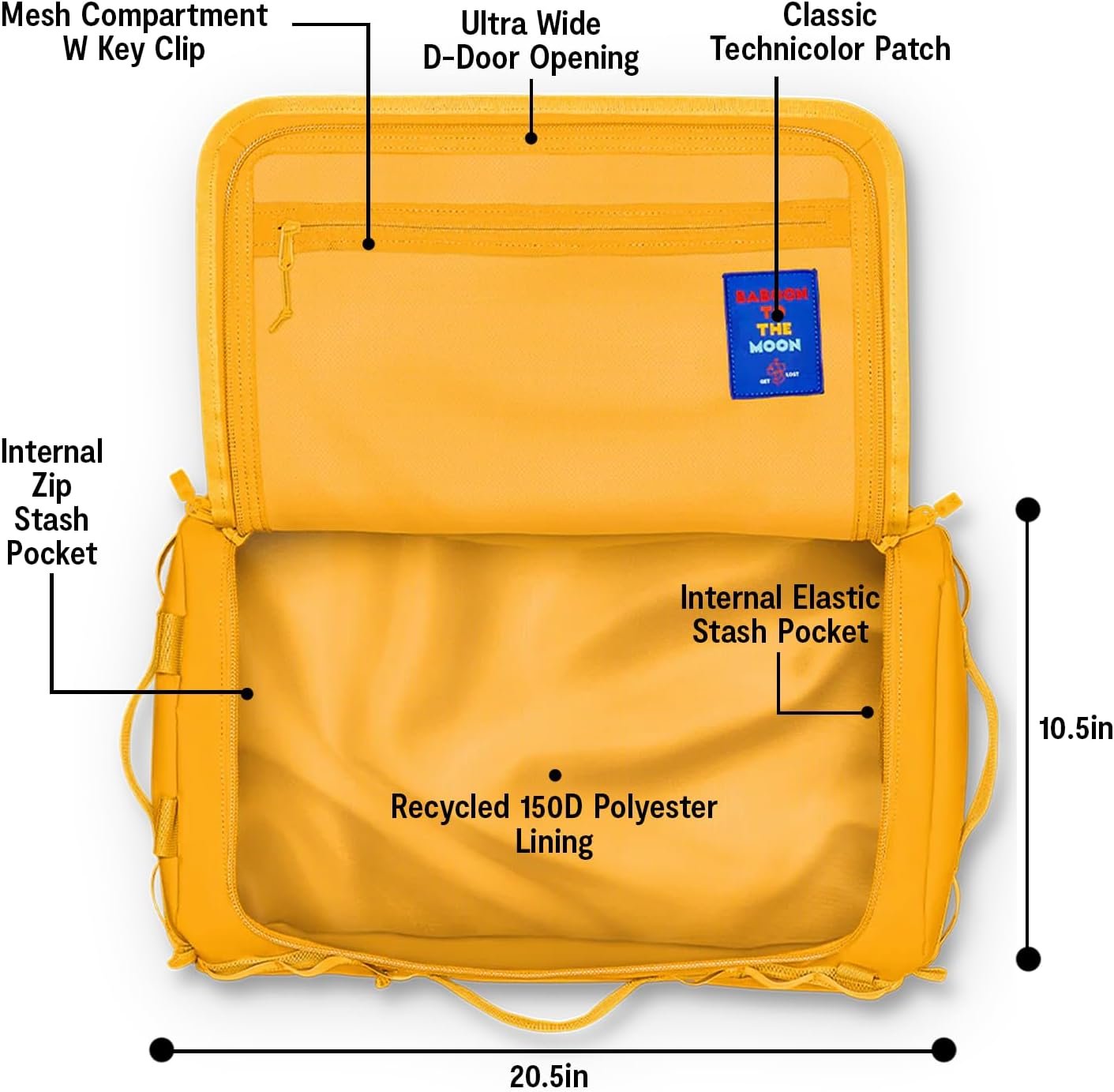 Volume: 40 Liters Size: H 10.5in x W 20.5in x D 12.5in Weight: 3.5 lbs Phthalate-free PVC fabric + 150D OM Stardust Polyester Lining