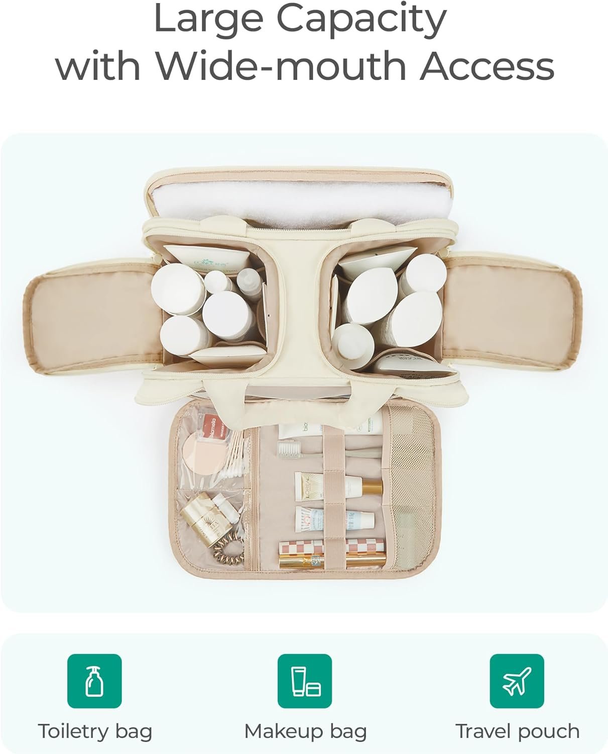 Main Compartments of Toiletry Bag : Two main compartments of toiletry bag for women is large capacity, with elastic straps hold bottles upright; double zipper compartment is for easy access. Partition storage can make your items more organized and avoid piling up.