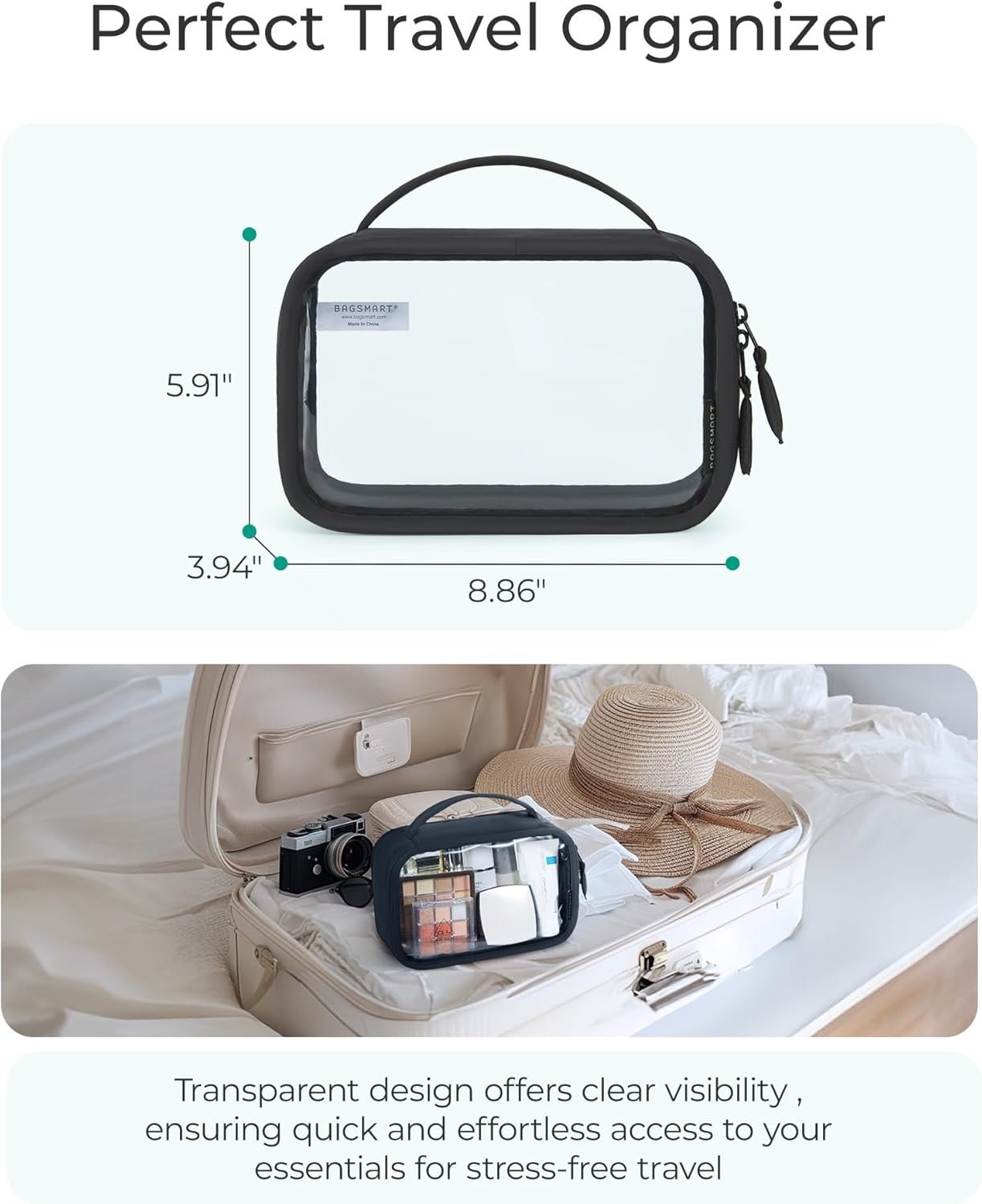 Lightweight and Portable with Ample Storage Space: Weighing just 0.33 lbs and featuring a soft puff handle, this bag is perfect for travel and fits easily into your carry-on. The transparent design makes it ideal for storing travel-sized toiletries, cosmetics, medications, personal items, and more