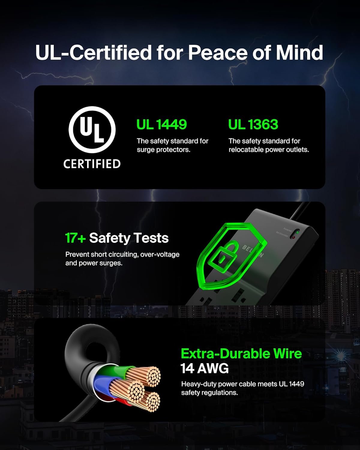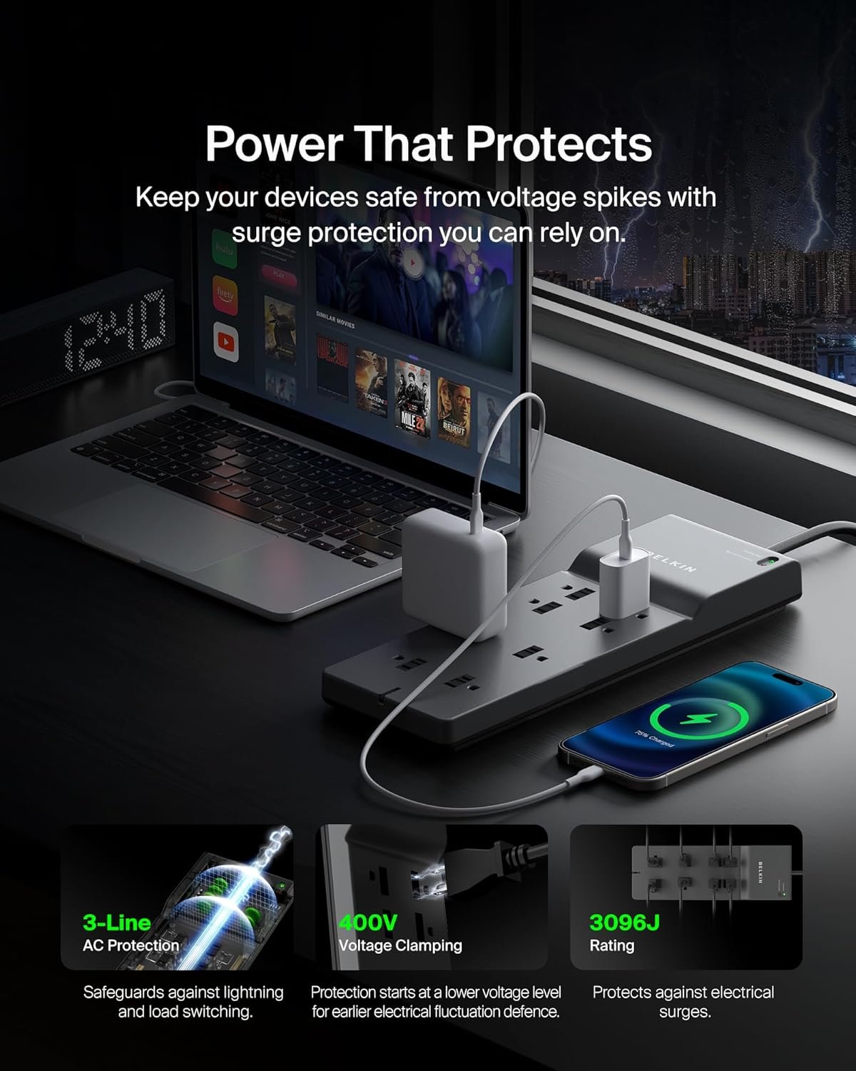 Keep your home, electronic devices, and appliances safe from unforeseen voltage fluctuations, power spikes, lightning strikes, and transient electricity that might damage and destroy them. The Belkin Surge Protector has a built-in voltage sensing circuitry that detects and responds to your device’s power needs.