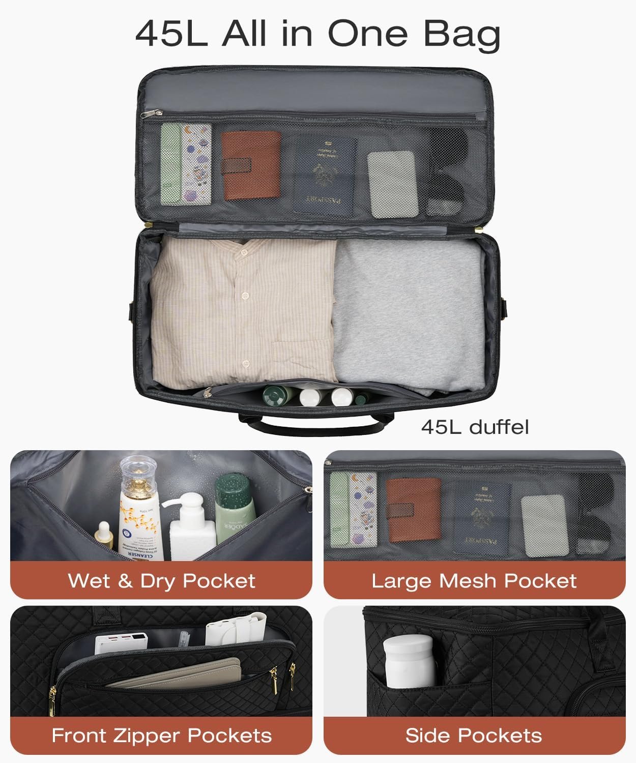 Organized and Accessible: Say goodbye to the chaos of unorganized travel duffel bags. Our overnight bag features a large main compartment with a visual mesh bag, a wet/dry separation pocket that keeps toiletries and damp towels organized. Also the duffle bag for travel has an organized compartment on the front panel for your other essentials. 2 side pockets for water bottle, all crafted to make packing and access effortless.