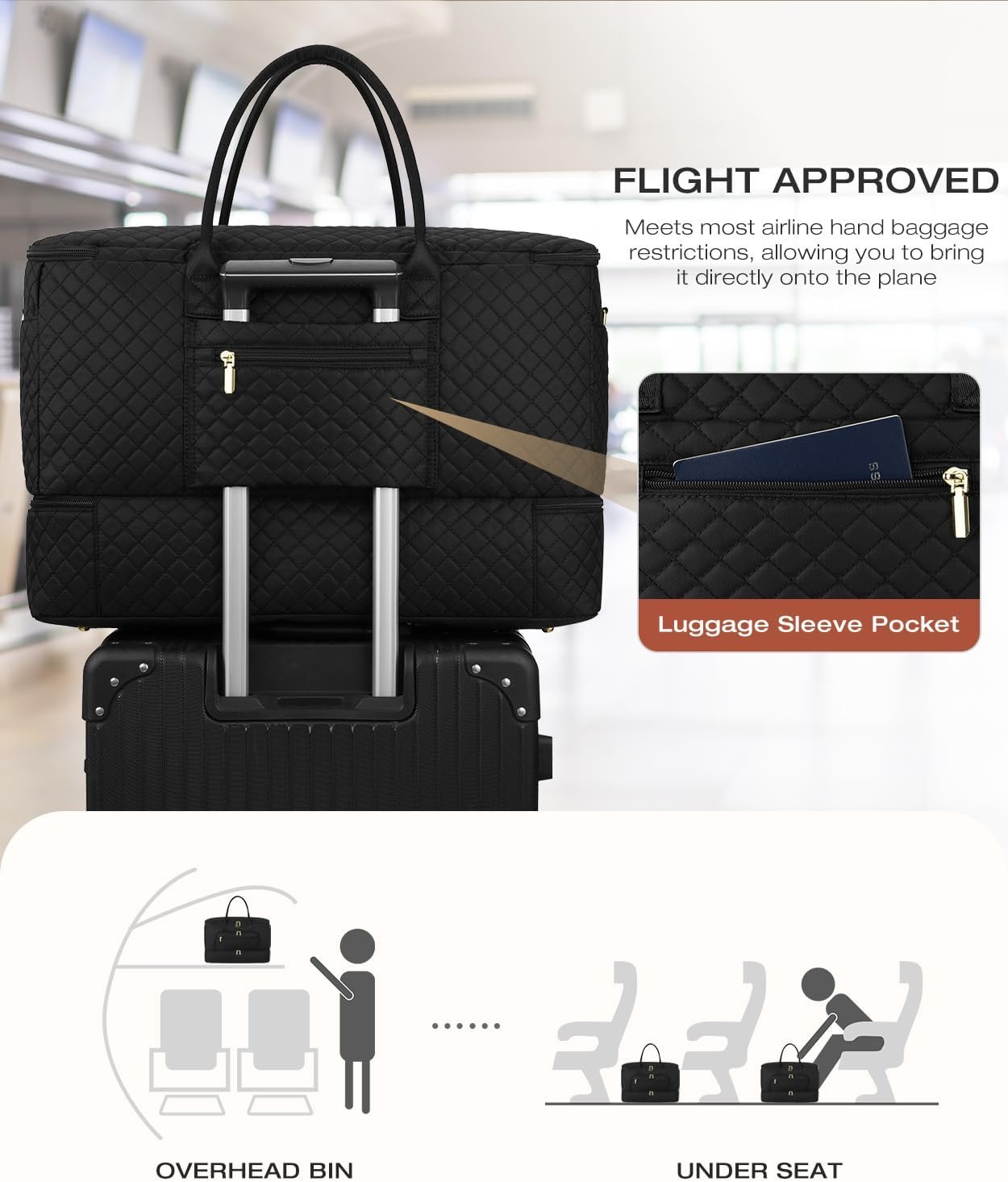 Aircraft Carry on Bag: Dimensions: Designed to meet most international carry-on requirements and can fit in the overhead luggage compartment. Duffel bags for traveling has a built-in sleeve that slides over a rolling luggage handle. One zippered pocket on the back to hold your smart phone, IDs or passport. It is an ideal overnight carry on bag for your business or personal travels.