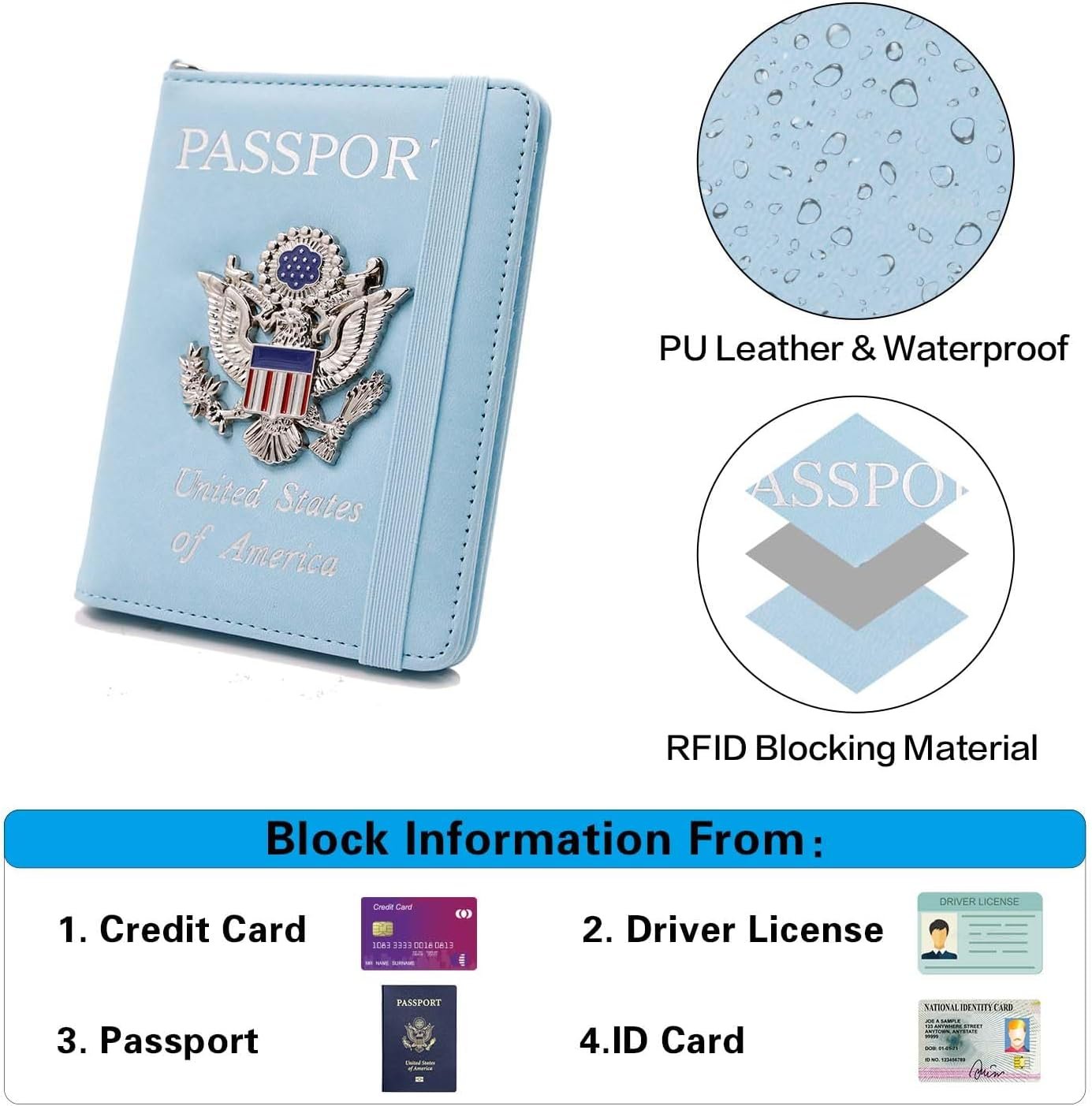 SECURITY PROTECTIVE:RFID blocking shield material inside, Our passport case has a material engineered specifically to block 13.56 MHz or higher RFID signals and protect our important private information stored on your passport and credit cards from unauthorized scans.To ensure the security of your personal information.Besides, the elastic strap is so important to keep everything secure.The passport holder cover case have 3 card pockets,1 transparent window, 1 slot for plane ticket , 1 passports holder slot.