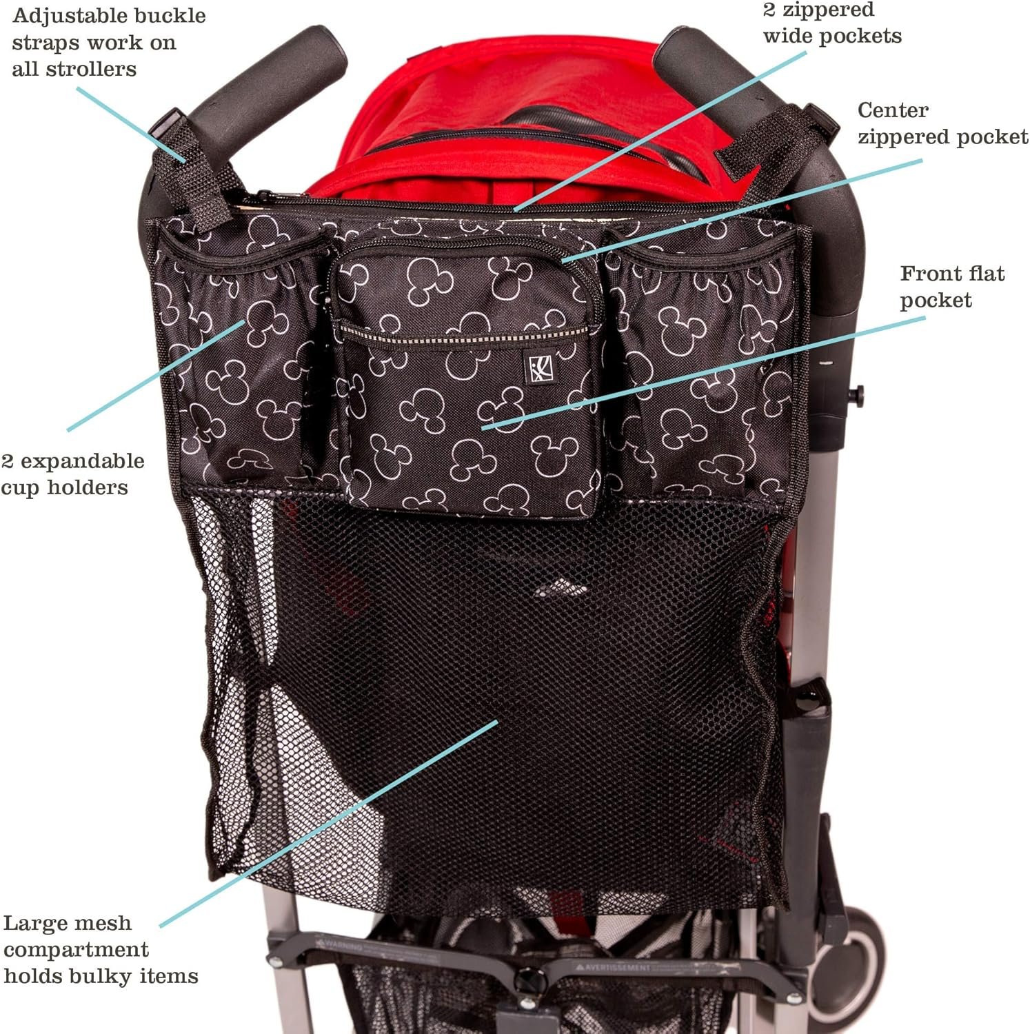 Stay super organized while on-the-go with the Disney Baby by J.L. Childress Cups ‘n cargo universal stroller organizer. This organizer attaches to any stroller with two adjustable buckle straps and has a Front zippered pocket for small, personal items. It has two expandable cup holders that hold all bottle and cup shapes and sizes. In addition, there are two long zippered pockets (great for diapers, wipes and your wallet) and a large, easy-view mesh pocket for larger items like blankets and extra clothes. A subtle Mickey Mouse print adds a touch of Disney magic! Whether you are traveling to a Disney theme park or just strolling through the neighborhood, this organizer adds extra storage space and keeps you organized. Material – Polyester
