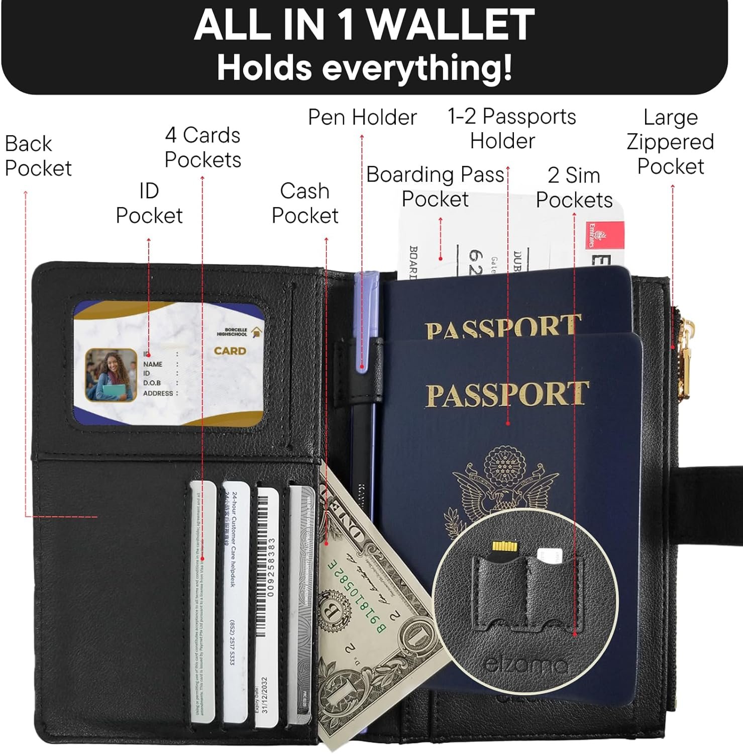 Black passport wallet for women with sim card pocketBlack passport wallet for women with sim card pocket