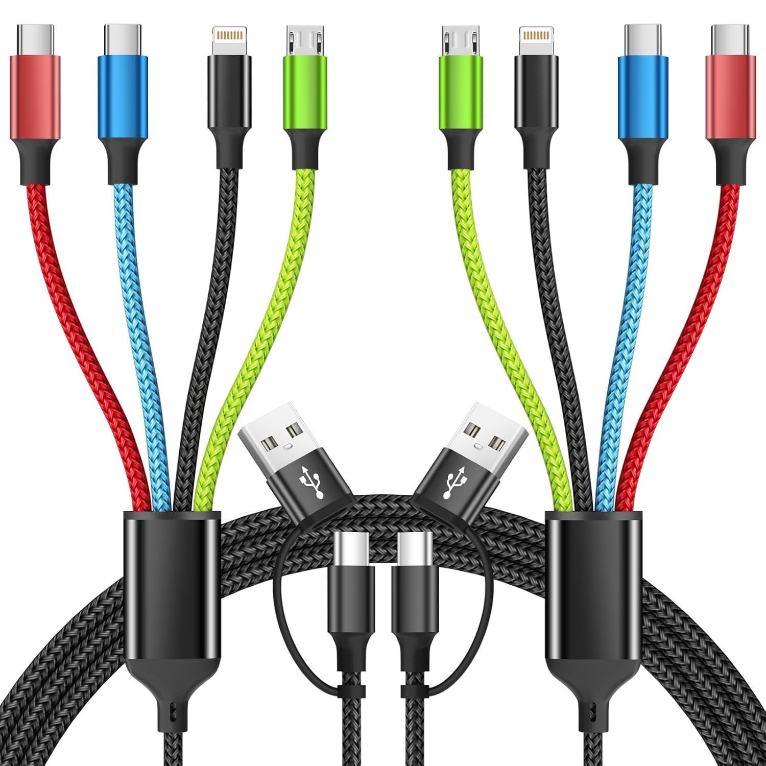 4 in 2 Charging Cable: This multiple charging cable with different ports using our universal 4 in 2 charging cable. It supports iPhone, USB-C, Micro USB, and more, eliminating the need for multiple charging cables. (Dual Type-C Port. Only iOS Connector Support Data Sync, 480Mbps)