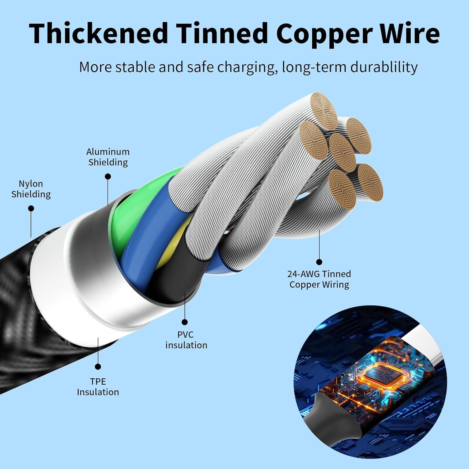 Safe and Reliable: Firsting 4 in 2 usb charging cable material is tin-plated copper, this material is better than pure copper, tin-plated copper wire is plated with a layer of tin on the surface of pure copper wire, this layer of tin can effectively prevent the oxidation of the copper wire, so as to improve its corrosion resistance and oxidation resistance, and prolong the service life