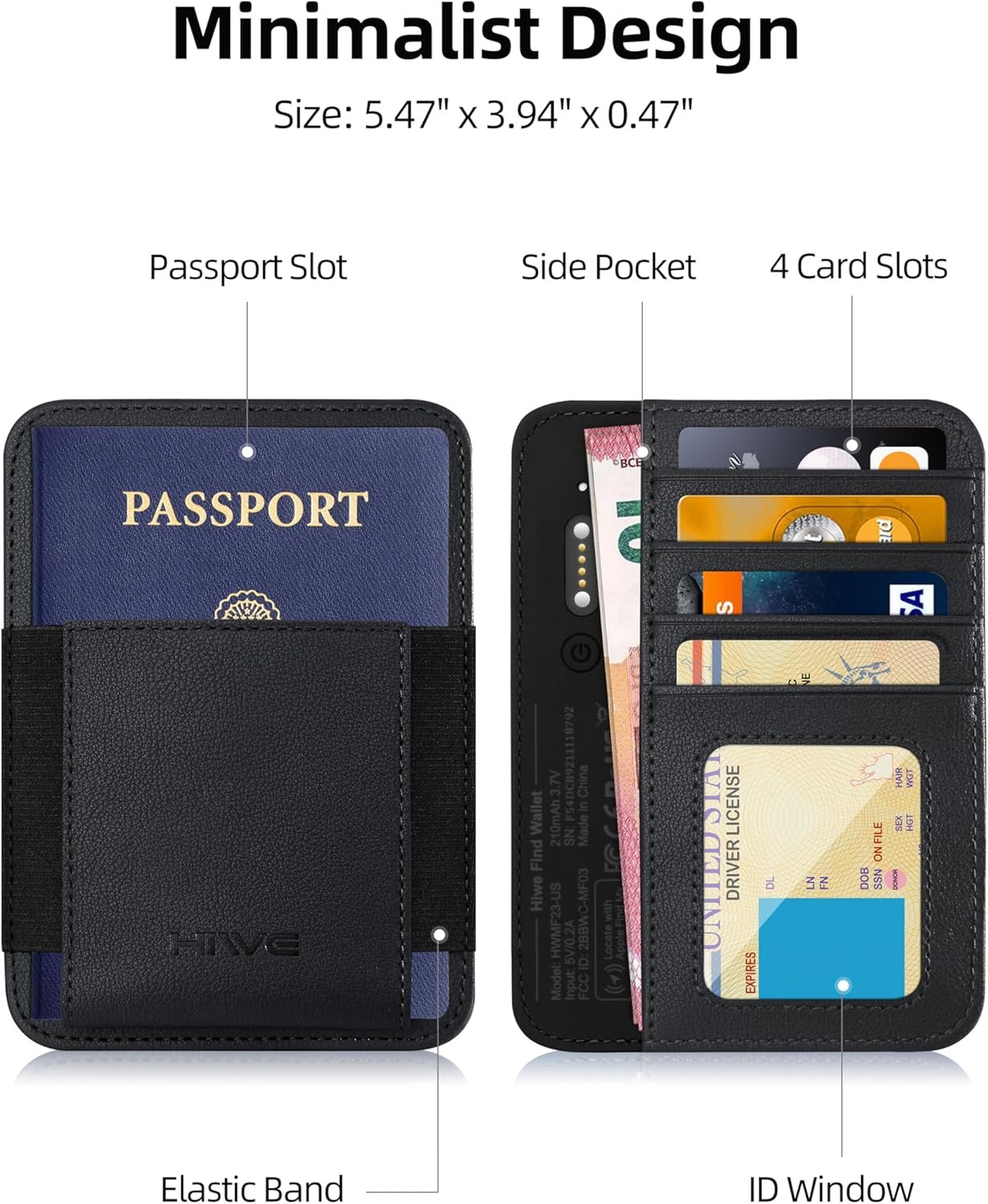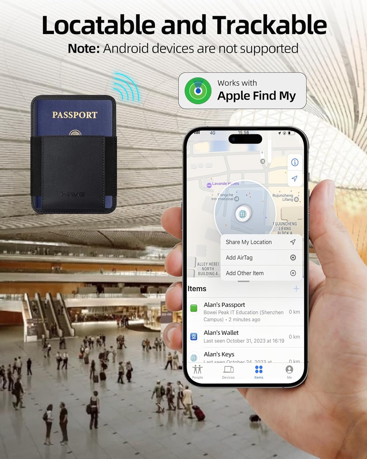 HiWe Passport Holder for Travel with Rechargeable Find My Tracker Built in, Minimalist Leather Passport Wallet Card Holder for Men and Women, RFID Blocking, 4 Slots, 1 Pocket, ID Window, Black