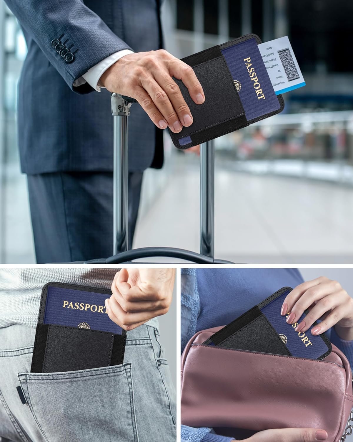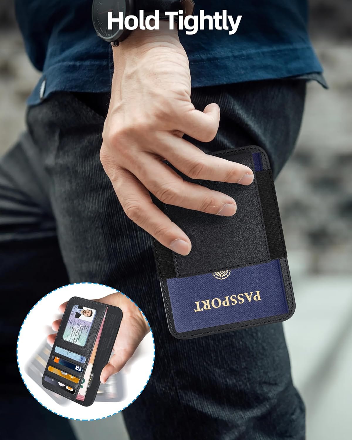 【Minimalist & Portable】 4 card slots with 1 ID Window, 1 side pocket for cash or travel documents, 1 pocket with stretchy band for 1-2 passports; Slim 5.47″*3.94″*0.47″, Lightweight 2.19 oz; Crafted from premium Vegan leather and precision craftsmanship