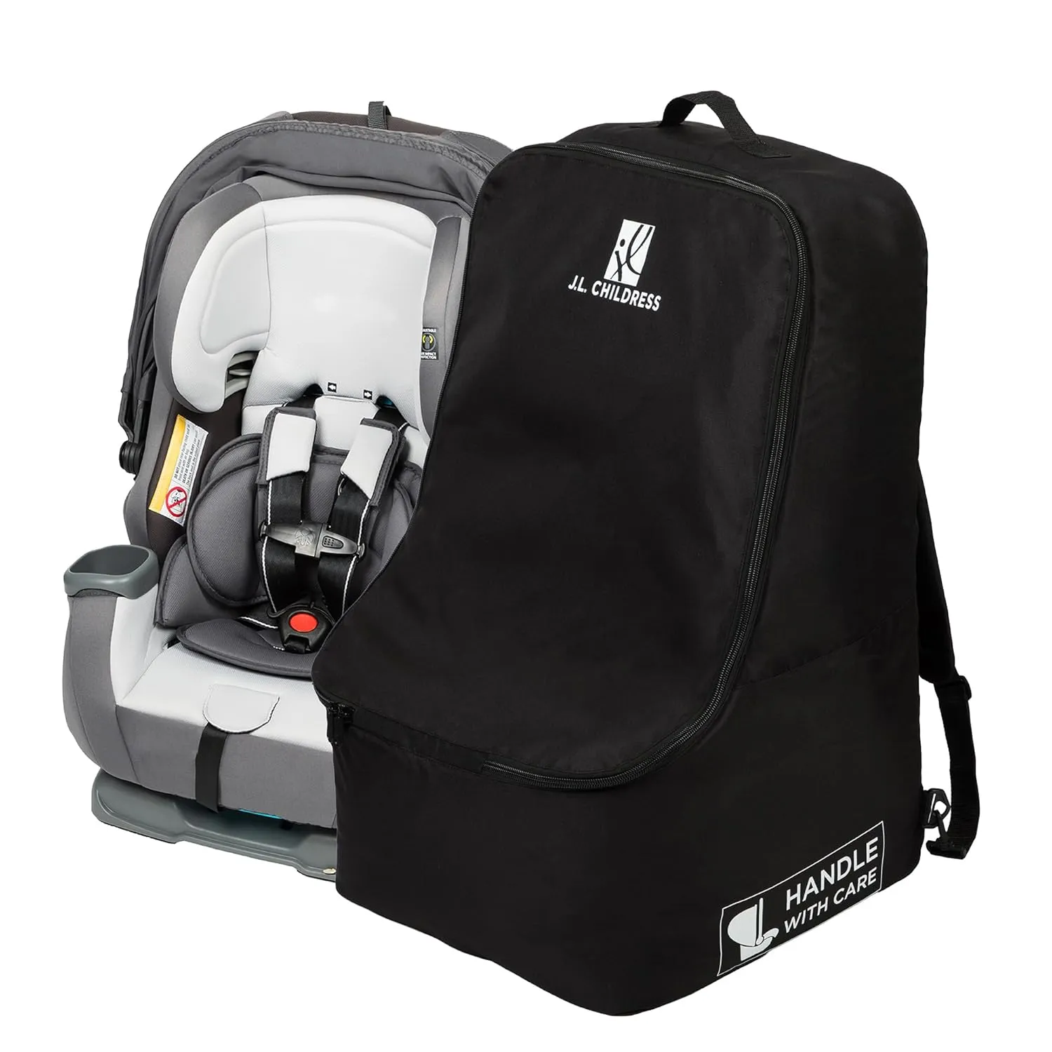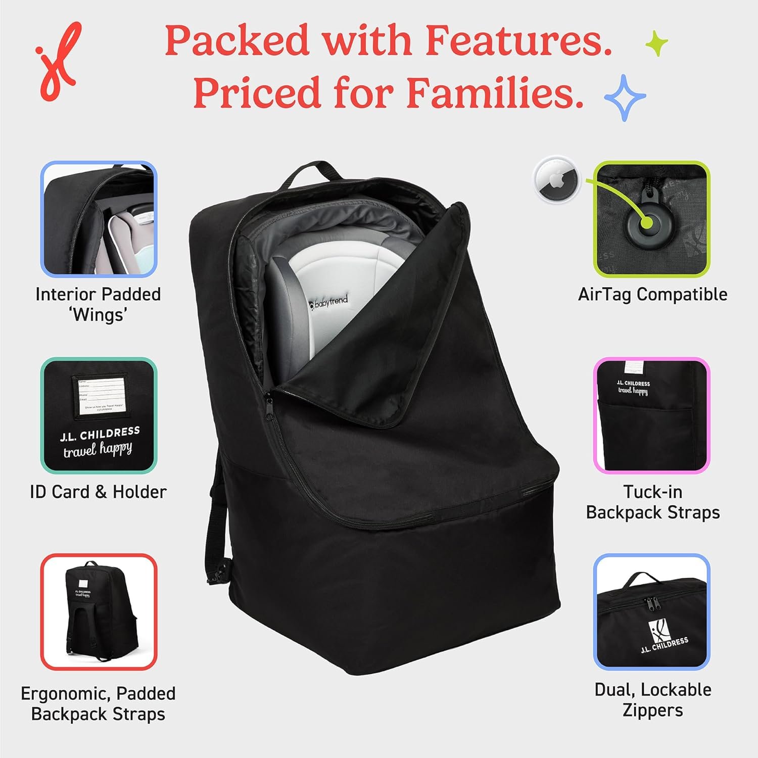 Invented by J.L. Childress almost 20 years ago, the idea of a backpack to carry your car seat has brought ease and peace-of-mind to millions of traveling families around the world. Your purchase supports our American small business and our family of employees. From our family to yours, Travel Happy! Have no fear, the Deluxe Padded Backpack Car Seat Travel Bag is here! This bag has serious superpowers: it’s not only the highest consumer-rated car seat travel bag available, it also properly protects your child’s car seat and enables you to be hands-free to push strollers, pull luggage and wrangle your kids. The padded, harness-style backpack straps are ergonomically designed to position the car seat higher on your back for comfortable carrying. The backpack straps also detach and can be tucked away to avoid damage during transit. The Deluxe offers thick, 10mm premium padding on all sides AND padded interior wings to protect your car seats’ safety features. Durable, 600D polyester fabric withstands travels of all kinds. A NEW Apple AirTag holder allows you to always know where your car seat is. The secure silicone holder conceals the AirTag and ensures it stays in one place during transit (AirTag holder not included). Additional features include an ID card and dual-zipper opening to make it easy to put in and take out your car seat. TIPS: When traveling with an infant car seat, detach the base and place it on top of the car seat inside the bag. PLEASE MEASURE YOUR CAR SEAT AND CHECK DIMENSIONS PRIOR TO PURCHASE. Bag measures 33″H x 20″w x 20″D; however we recommend you check our complete Compatibility Guide on JLChildress.com. Protected by J.L. Childress’ Lifetime Warranty and back by our U.S. Based Customer Service Team.