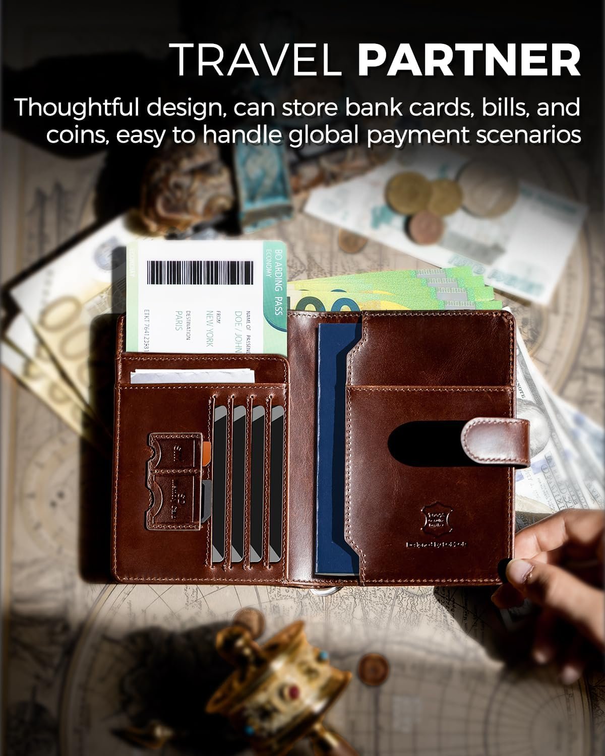 All in One Travel Wallet: This intelligently partitioned passport wallet for men features dedicated slots for cards, unfolded bills, and a zippered coin pouch, so no matter which country you travel to or what form of currency you use, tipping in USD, bargaining with EUR, hoarding YEN, or counting THB, etc., every currency nests securely in its tailored cradle. One wallet, every currency, every border—true global freedom in your pocket