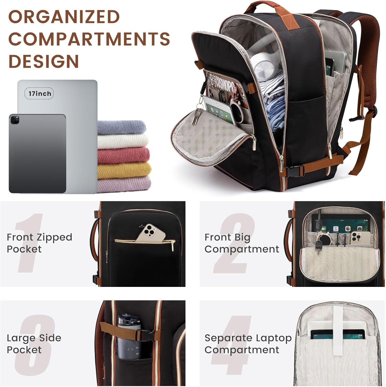 🧳【40L LARGE CAPACITY】Our travel backpacks enable you to pack all your travel essentials for a 3-5 day travel, which can hold 3-5 days’ clothing, a pair of shoes, your wallets, toiletries, a 17.3” laptop, a 12.9” iPad and so on. The side straps can also help you compress the pack when it is too full.