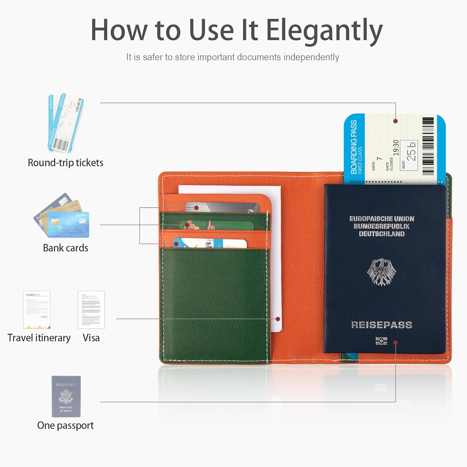 Minimalist Structure: 1 passport holder slot, 3 practical slots for credit cards, business or membership cards, 1 pocket for boarding passes and tickets.
