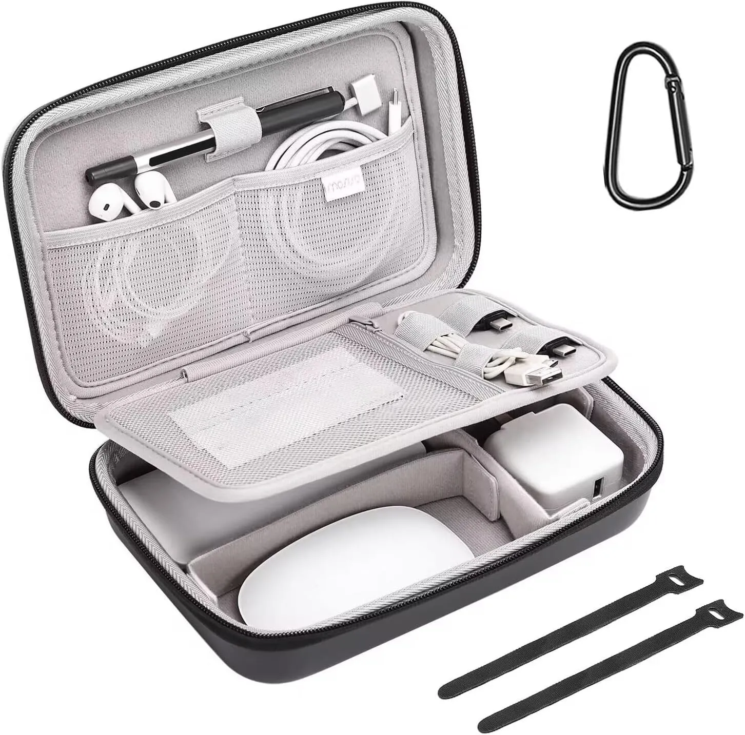 This multifunctional electronics carrying case storage bag is designed to be compatible with MacBook power adapter, compatible with Magic Mouse & Pencil, compatible with AirPods, SD card, cable, charge, power bank, USB flash disk and other accessories. Compact design with handle & snap hook which makes it easier to carry in backpack, suitcase, luggage or hanging around wrist.