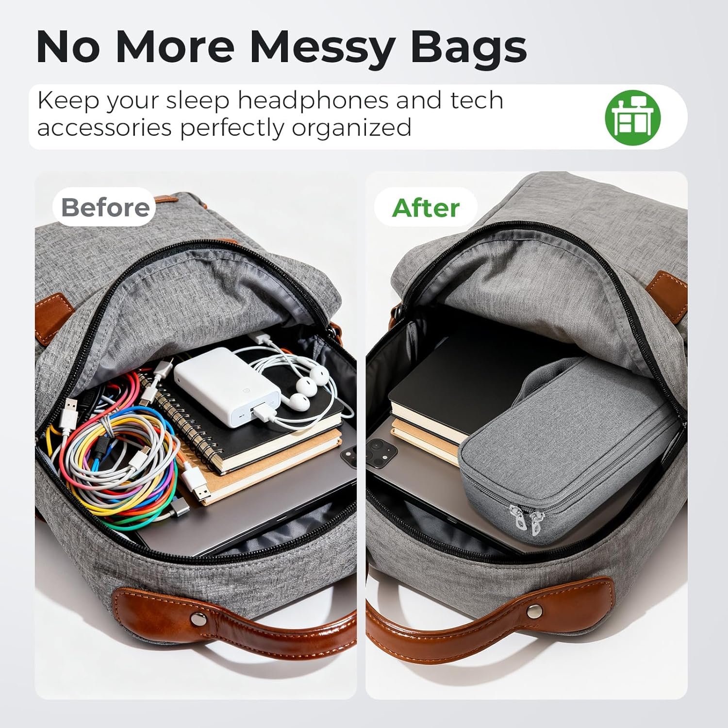 🎒 Spacious Multi-Compartment Storage – Designed with multiple pockets and flexible partitions to keep your Bluetooth sleep mask, charging cables, adapters, and travel accessories neatly stored. (Sleep mask and electronics shown in images are not included.)