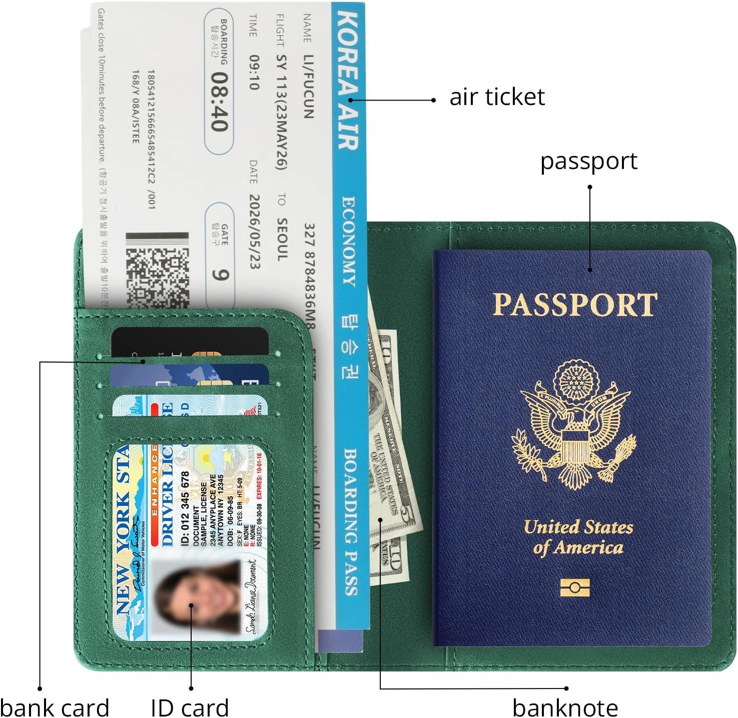 【Multi-Purpose】:The travel passport holder has a unique interior design and multiple functions, which can provide safe storage for your passport, air tickets, boarding passes, business cards, credit cards and cash.