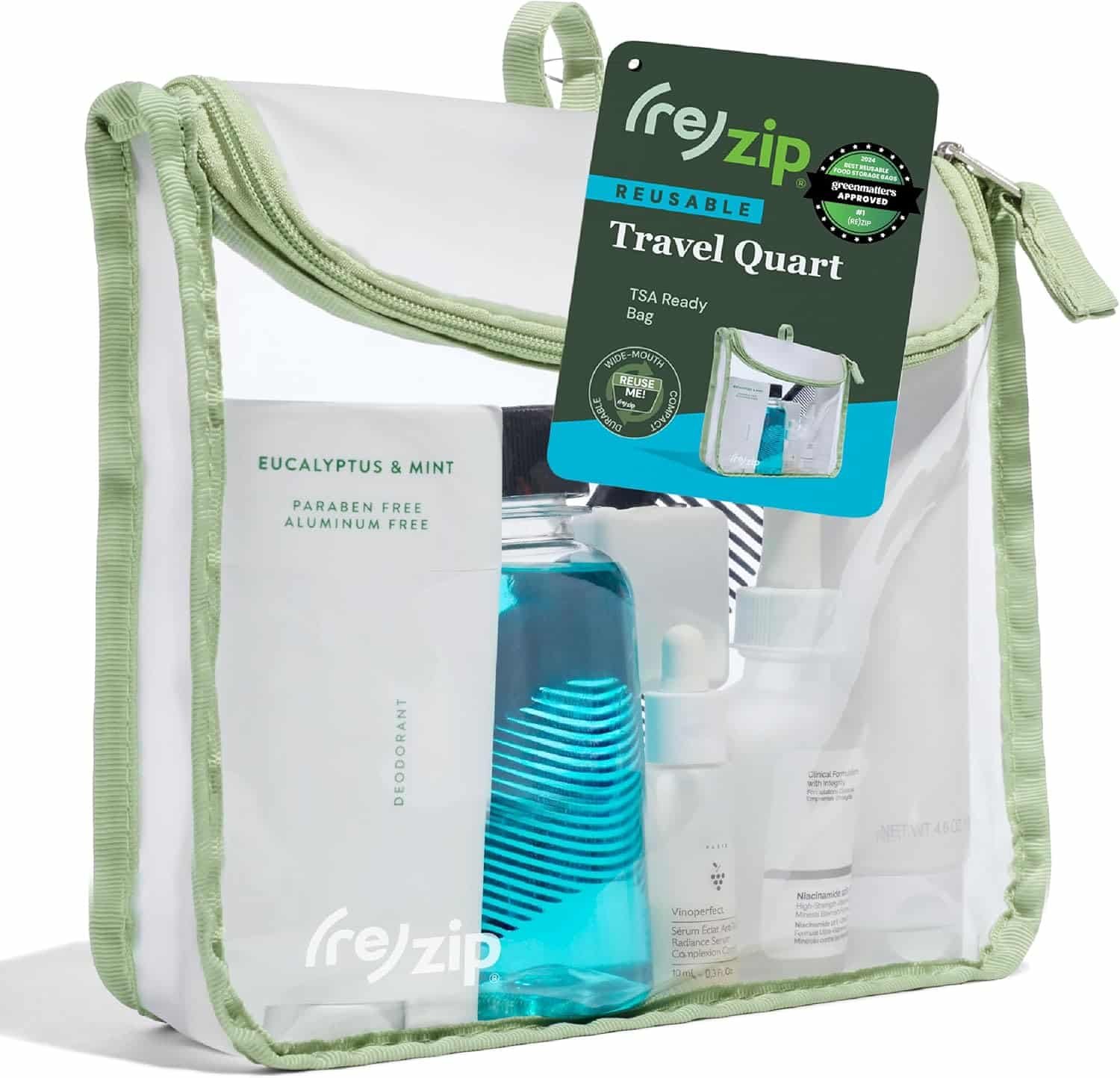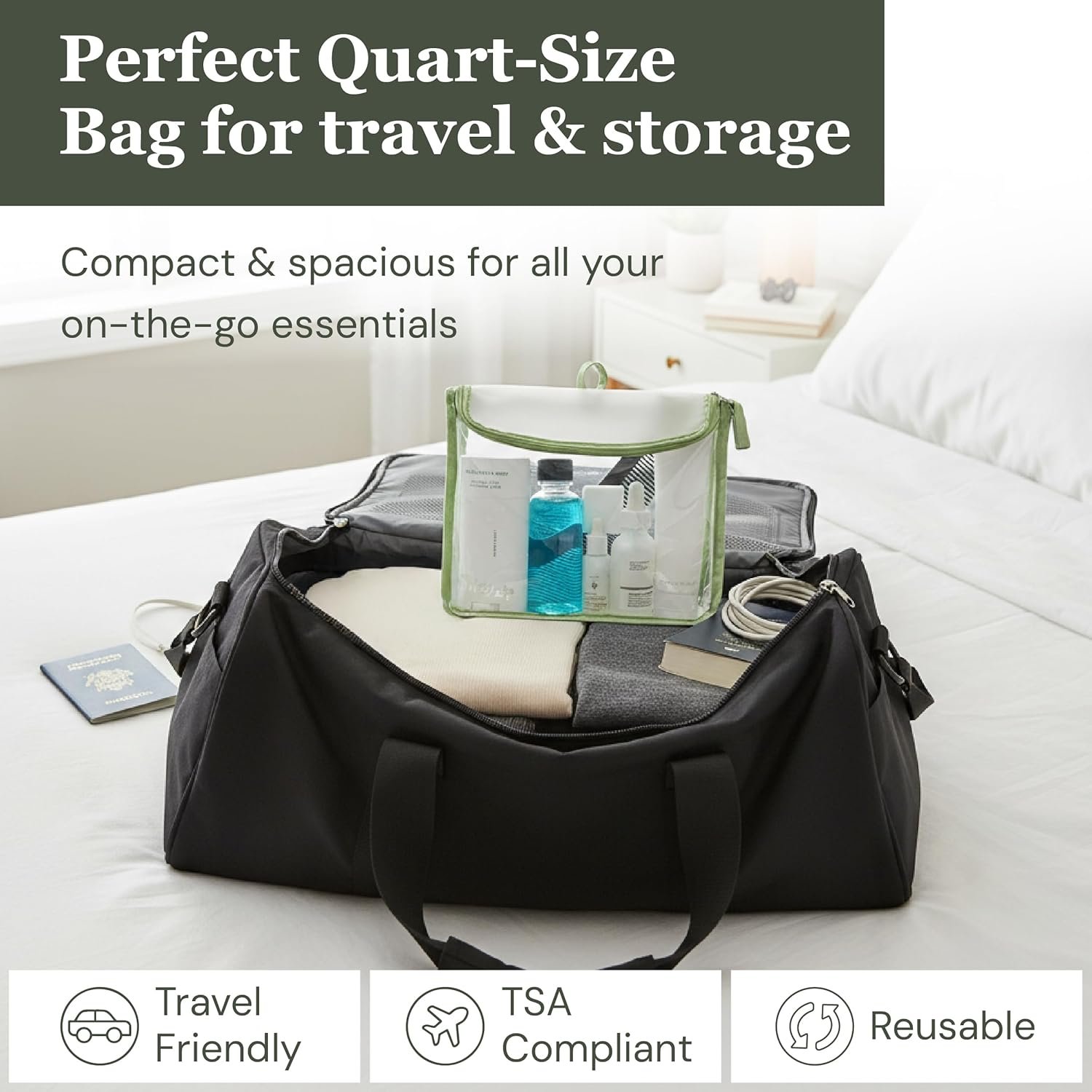 (re)zip TSA Approved Travel Toiletry Bag with Hanging Loop, Travel Quart Bag– Reusable Clear Makeup bags with zipper, Clear Pouch for Travel Essentials, Cosmetic | BPA-Free, Machine Washable – Sage