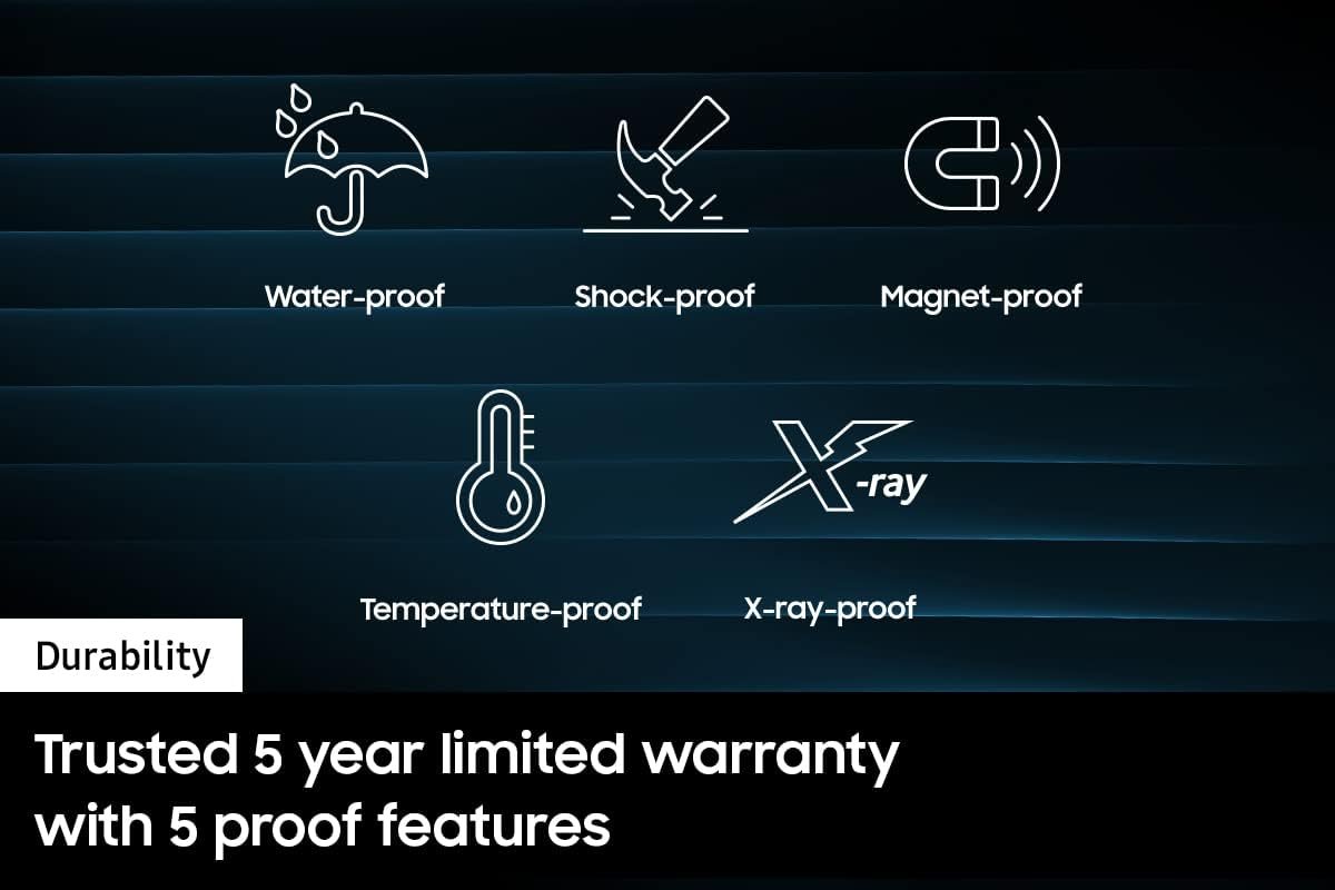TOUGH & TRUSTED***: Files stay secure, no matter the terrain; Samsung’s flash memory technology makes the Type-C a trustworthy drive to store your valuable data; It’s waterproof, shock-proof, magnet-proof, temperature-proof, and X-ray-proof body, plus it’s backed by a 5-year limited warranty