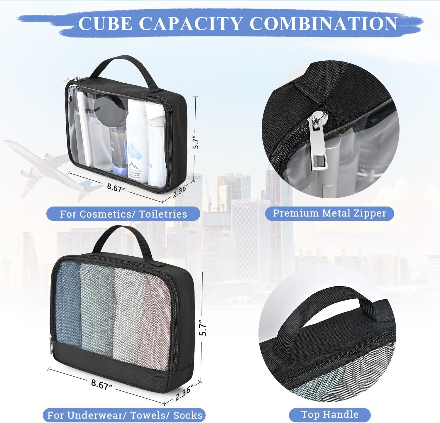 【Two Extra Toiletry Bags】: This backpack includes two extra toiletry bags measuring 10.24*7.87*3.15 inches and 8.66*2.36*5.7 inches. The net bag can be used to store dry items such as towels, and the transparent bag can be used to store cosmetics or toiletries, so that you can use the backpack more clean and tidy