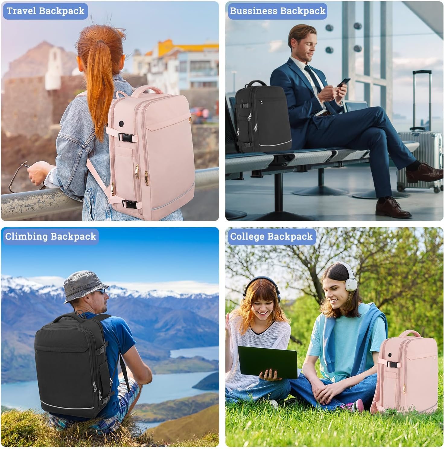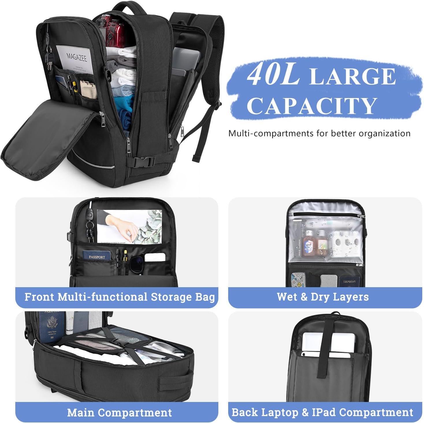 【Large Capacity & Multi-Pocket】: The 40L capacity is enough to support you for a short trip of 3-7 days, It can carry a 17.3 inch laptop,the multi-pocket separation design makes your travel more convenient, including the front zipper pocket,front pocket,main compartment, separate laptop compartment, and anti-theft pocket on the back
