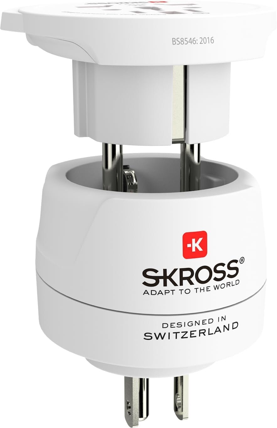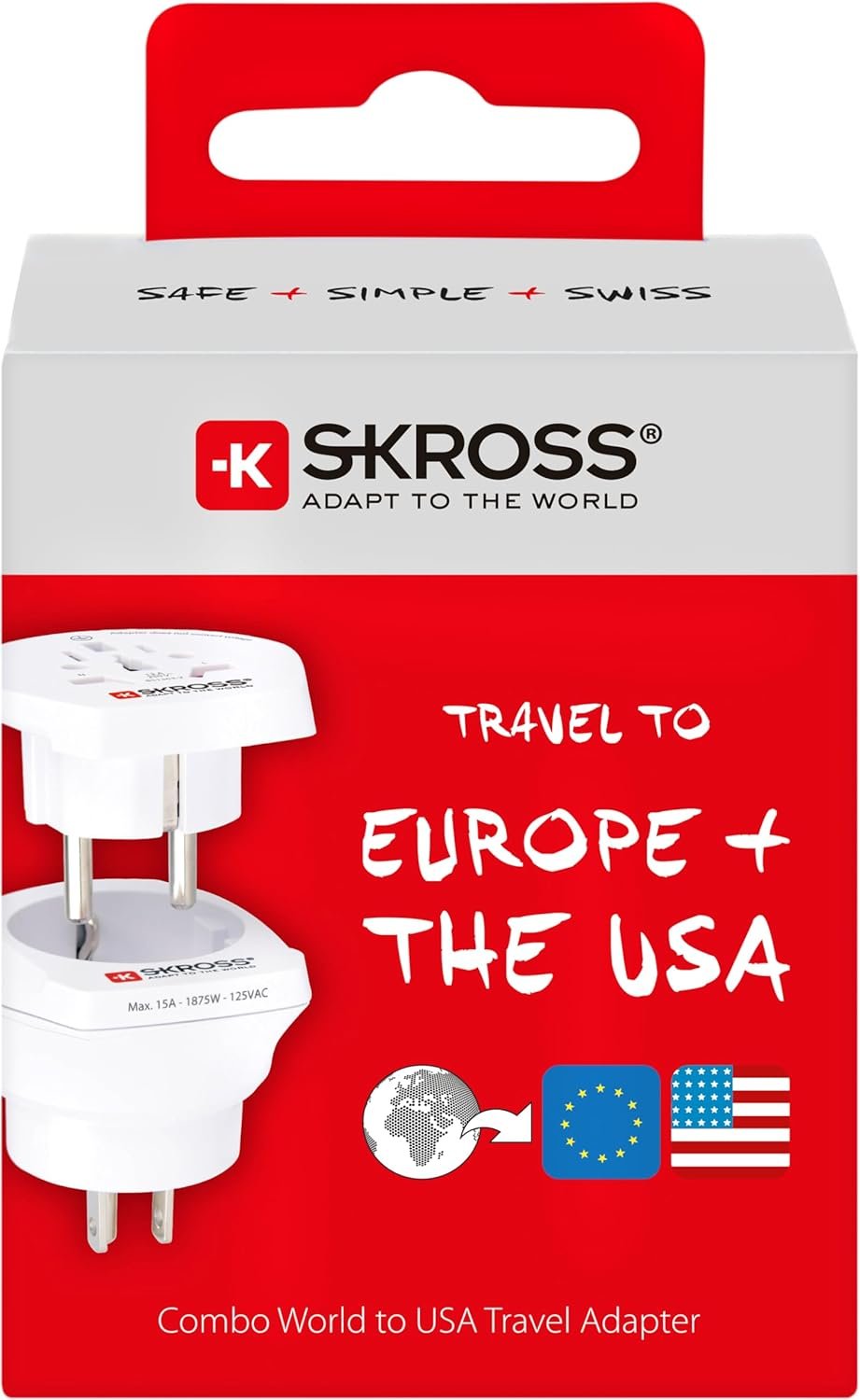 DESCRIPTION – This travel adapter ensures that the connection is easier than ever, not only in the US but also in all other countries with standard Schuko sockets (as predo- minantly found in Europe). Our SKROSS® Combo World to USA adapter offers global travelers a secure, reliable and easy connection in all countries with the US and Schuko standard, making it an ideal solution for business and leisure travelers. Technical specifications: • Designed in Switzerland • Suitable for equipment with 2 or 3 pin plugs • Input sockets: Switzerland, Italy, Brazil, UK, USA/Japan, Europe (Schuko & 2-pole Euro), Australia/China • Power outlets: USA, Europe (Schuko) • Input voltage: 100 V – 25 0 V • 0 Maximum load: 15A • Rated power: 100 V – 1500 W / 250 V – 3750 W • Does not convert voltage