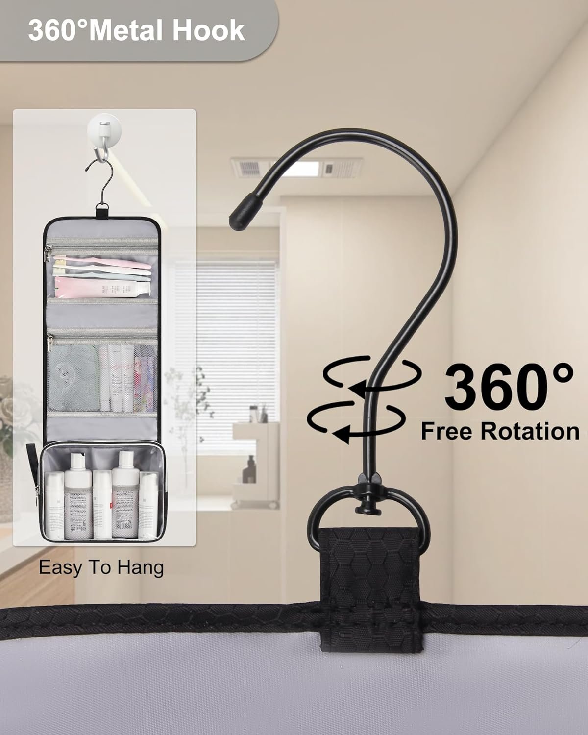 CONVENIENT DESIGN – Stow-away 360 degree swivel non-slip metal hook for versatile hanging options. It fits bottles upright, helps eliminate spills, and makes a great travel organizer for your travel toiletries