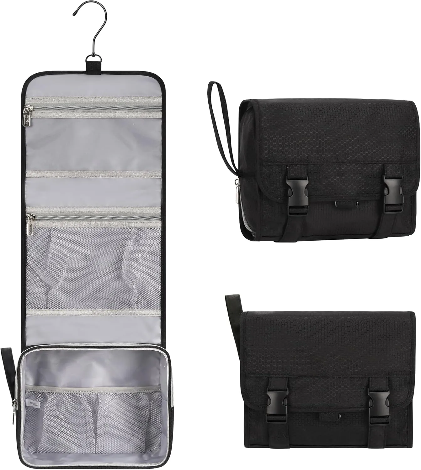 COMPACT for TRAVEL-SIZE ESSENTIALS – Foldable size with 9.4 x 7.7 x 6 inches. The space-efficient hanging toiletry container can hold all your travel essentials, such as cosmetics, travel-sized shampoo, Conditioner, and skin care products