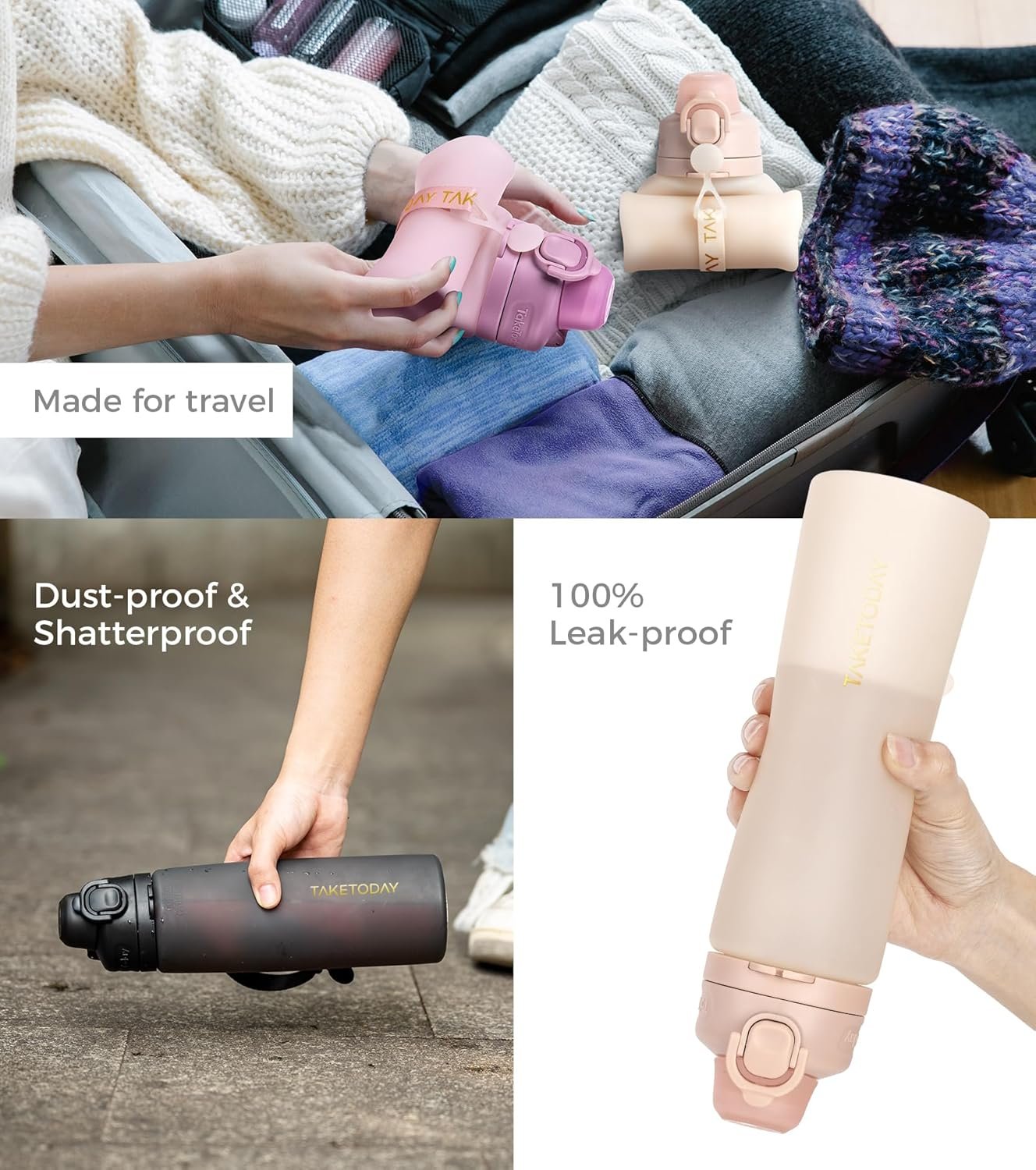 [Sturdy] The TakeToday collapsible water bottle is composed of high-quality food grade silicone. Unlike glass cups and plastic bottles, which are easily broken, the bottle body is soft and robust, able to withstand dropping, squashing, smashing, and hits, so you can enjoy using it without worry