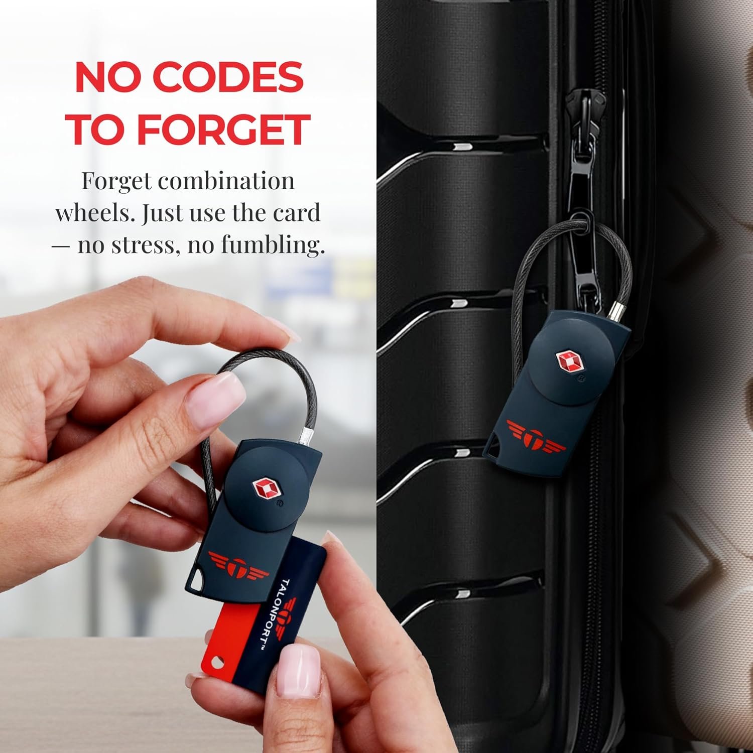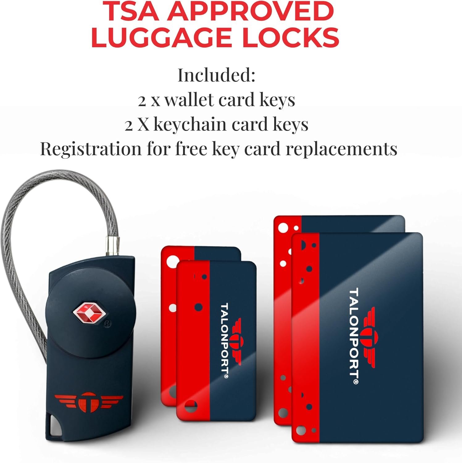 Travel with confidence thanks to the Talonport TSA Approved Keyless Luggage Lock — the smart travel essential built for durability, simplicity, and security. Crafted with premium all-metal construction, this slim suitcase lock slips onto your checked bag or carry-on and stays out of your way while defending your gear from damage and tampering. No more fiddling with combinations or losing tiny keys. This easy-to-use lock opens instantly when you place your card key into it — two credit-card-style keys and two key-ring cards are included. If you ever lose your cards, we’ll send replacements for life, keeping your travel worry-free. With its non-pickable mechanism and full compliance as a TSA locks for luggage, you get trusted protection when navigating airports, hotel rooms, lockers and more. And it’s not just a suitcase lock — this versatile travel lock also secures backpacks, gym lockers, tents, purses, laptop bags, hostel lockers and more. Choose Talonport for a lock that’s built to last, easy to use, and ready for every journey — your go-to travel essential for both leisure and business.