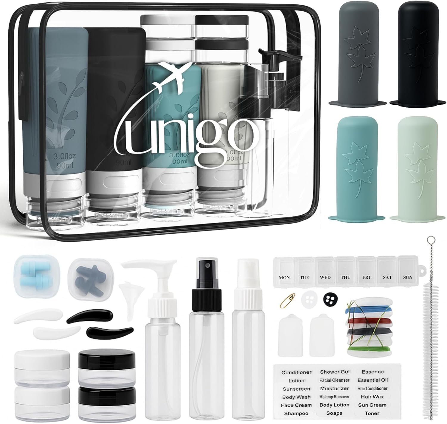 【Why Choose Unigo Travel Bottles For Toiletries】Unigo is made for those who love to travel smart. Every detail of our All-in-One 30 Pack Travel Bottles Set is designed to make your journey smoother — from leakproof refillable bottles with protective sleeves to thoughtful extras like a pill box, earplugs, and needle kit. Created by travelers for travelers, Unigo stands for quality, practicality, and global trust. Once you pack Unigo, you’ll never travel without it again.
