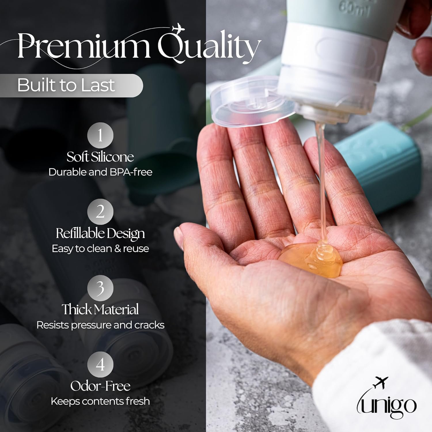 【Easy to Use & Store】Unigo bottles include a clear instruction guide for proper filling and sealing. Wash before first use, let dry fully, and store upright or in the travel bag, away from heat or sunlight. Simple steps for long-lasting, leak-proof performance on every trip.