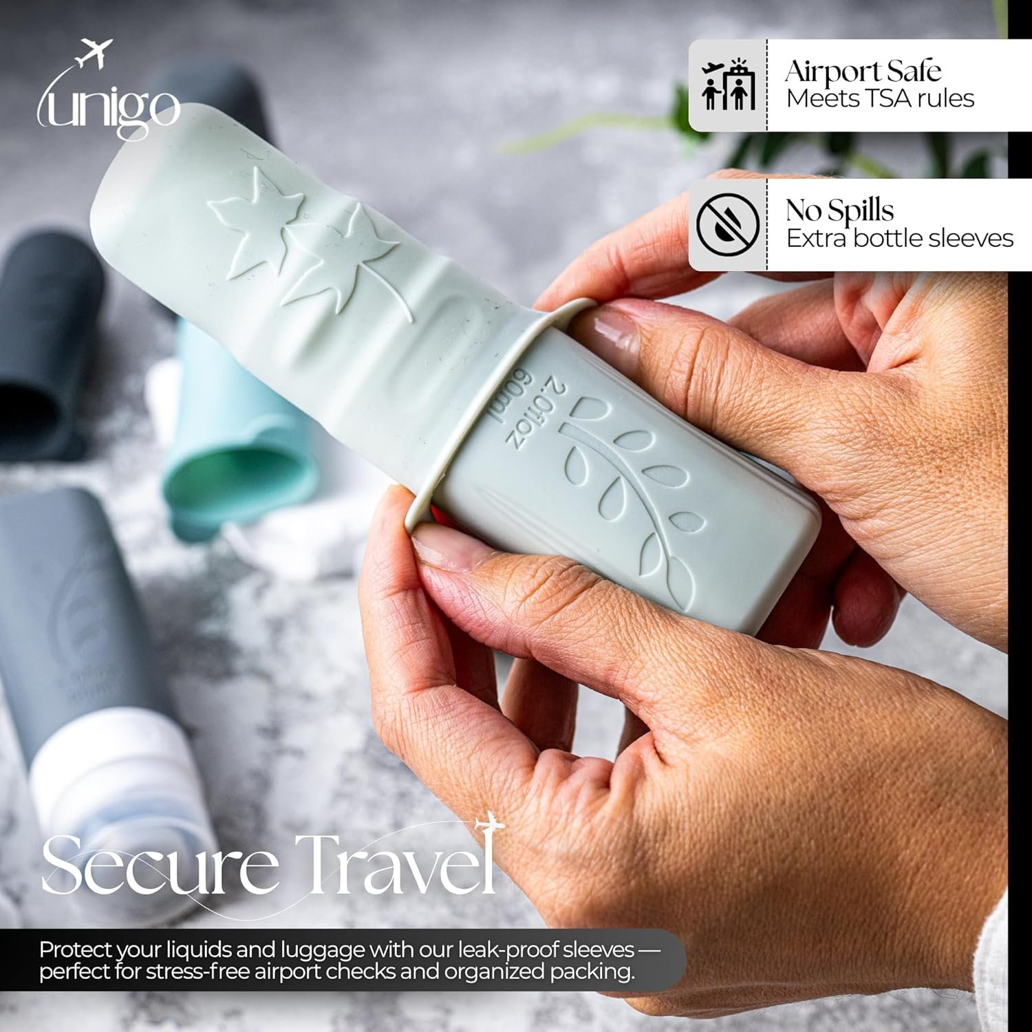 【Leak-Proof & TSA Approved】Unigo travel bottles for toiletries feature a triple-layer leak-proof cap and an air-tight valve that only releases liquid when squeezed — no leaks, no mess. Each bottle includes an extra protective sleeve, adding 2–3× more leak protection, even during air pressure changes on flights. Follow the included instructions for best use and enjoy a truly worry-free travel experience with TSA-approved travel size containers you can trust.