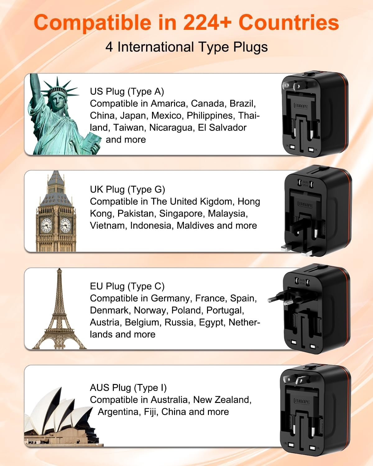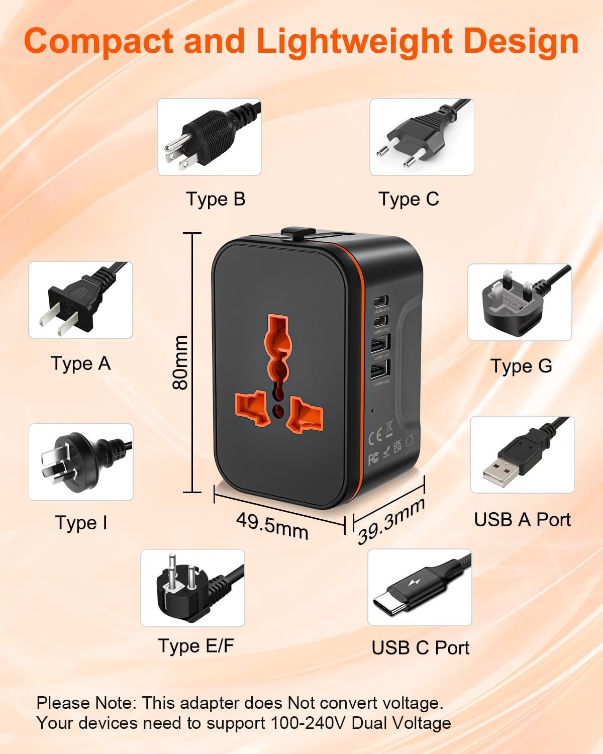 Compact for Traveling: This compact international power adapter measures 2.95 x 1.93 x 1.54 inches and weighs only 3.81oz, making it an ideal companion for your international travels. The travel universal adapter can save significant space in your luggage, eliminating the need to carry multi travel adapter plug during your trip.