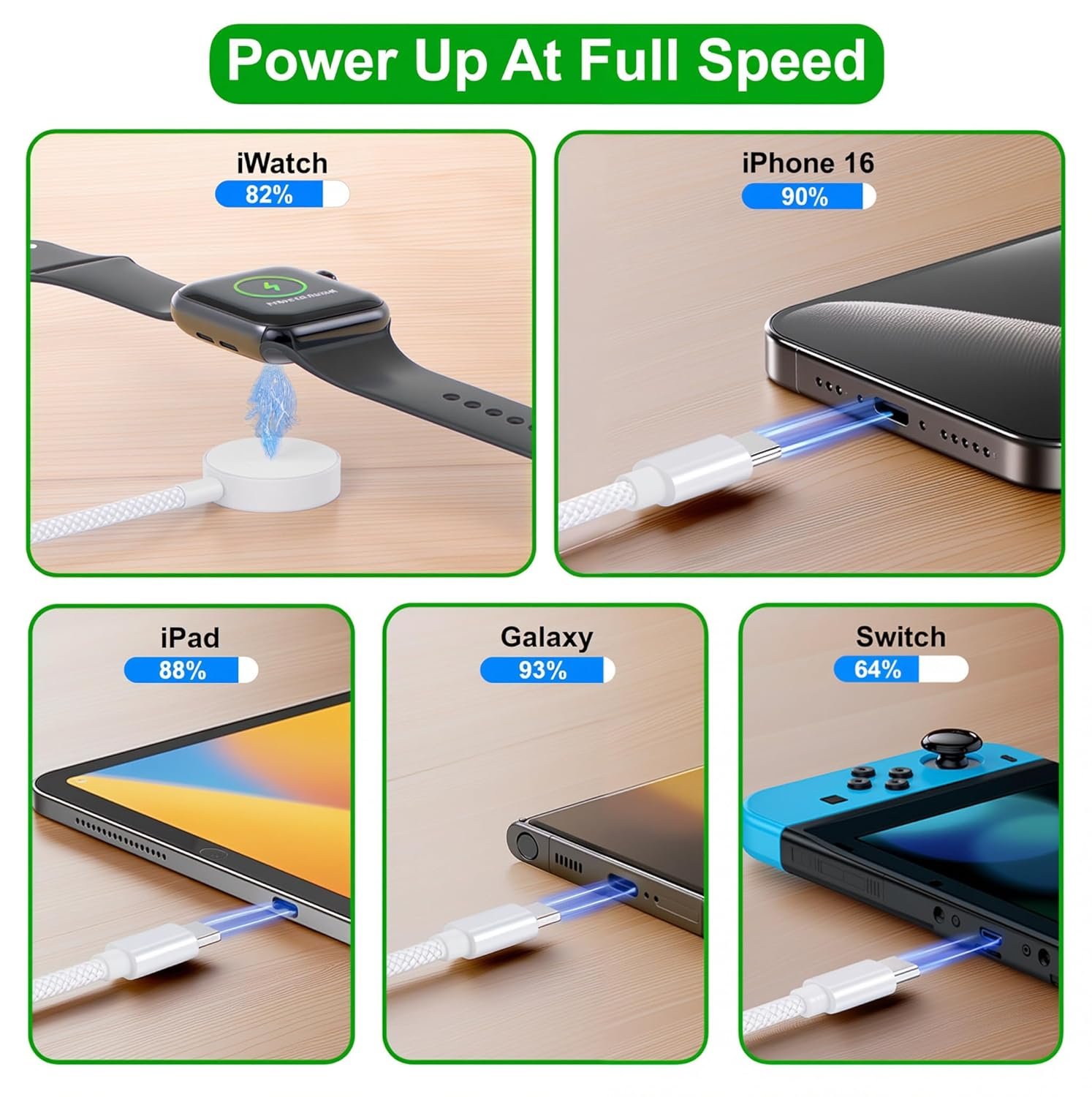 ⚡【𝐅𝐚𝐬𝐭 𝐚𝐧𝐝 𝐄𝐟𝐟𝐢𝐜𝐢𝐞𝐧𝐭 𝐂𝐡𝐚𝐫𝐠𝐢𝐧𝐠】 This 3 in 1 charging cable supports up to 2A fast charging, powering your devices quickly. Get your phone from 0% to 45% in just 35 minutes, and your watch up to 50% in 45 minutes. For best results, pair with a 20W USB-C power adapter (not included). Note: Data transfer not supported