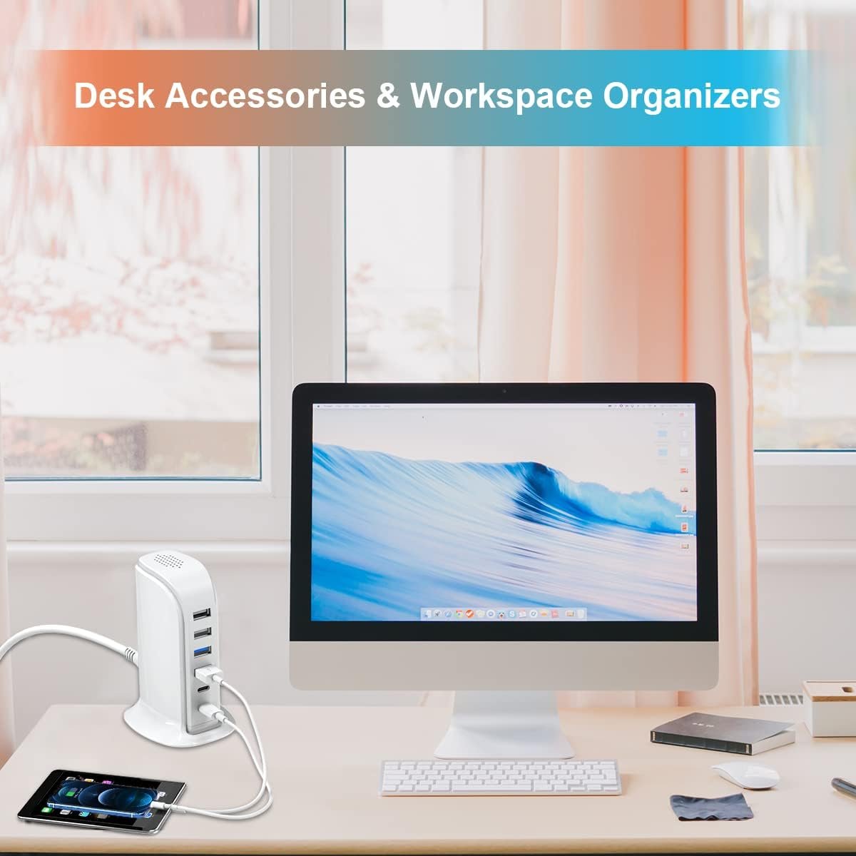 Desktop cable management: Charging station 6 ports with 5 ft power cord; Compact, Lightweight, Space saving, Portable, Versatile, USB charging hub for 6 devices simultaneously.