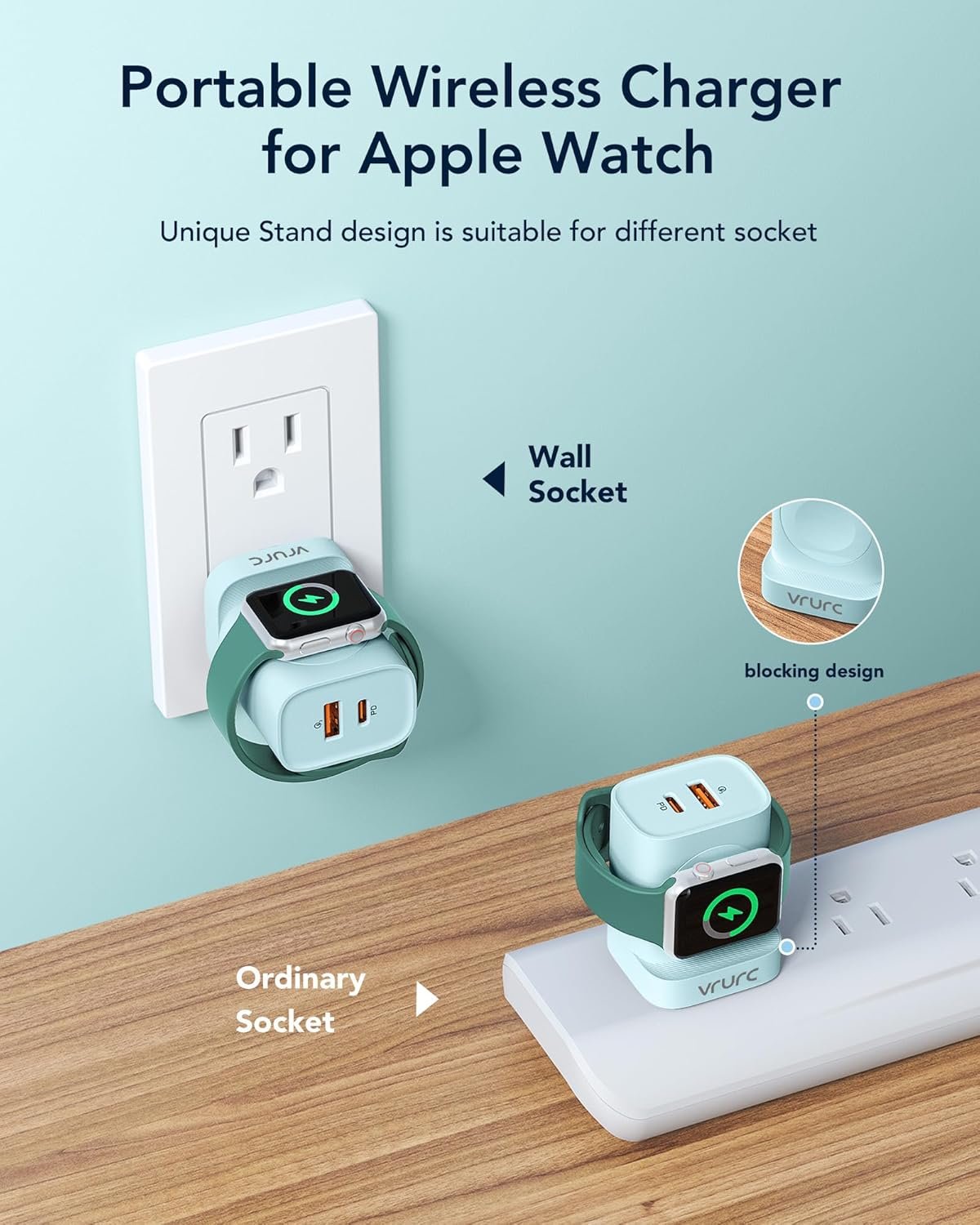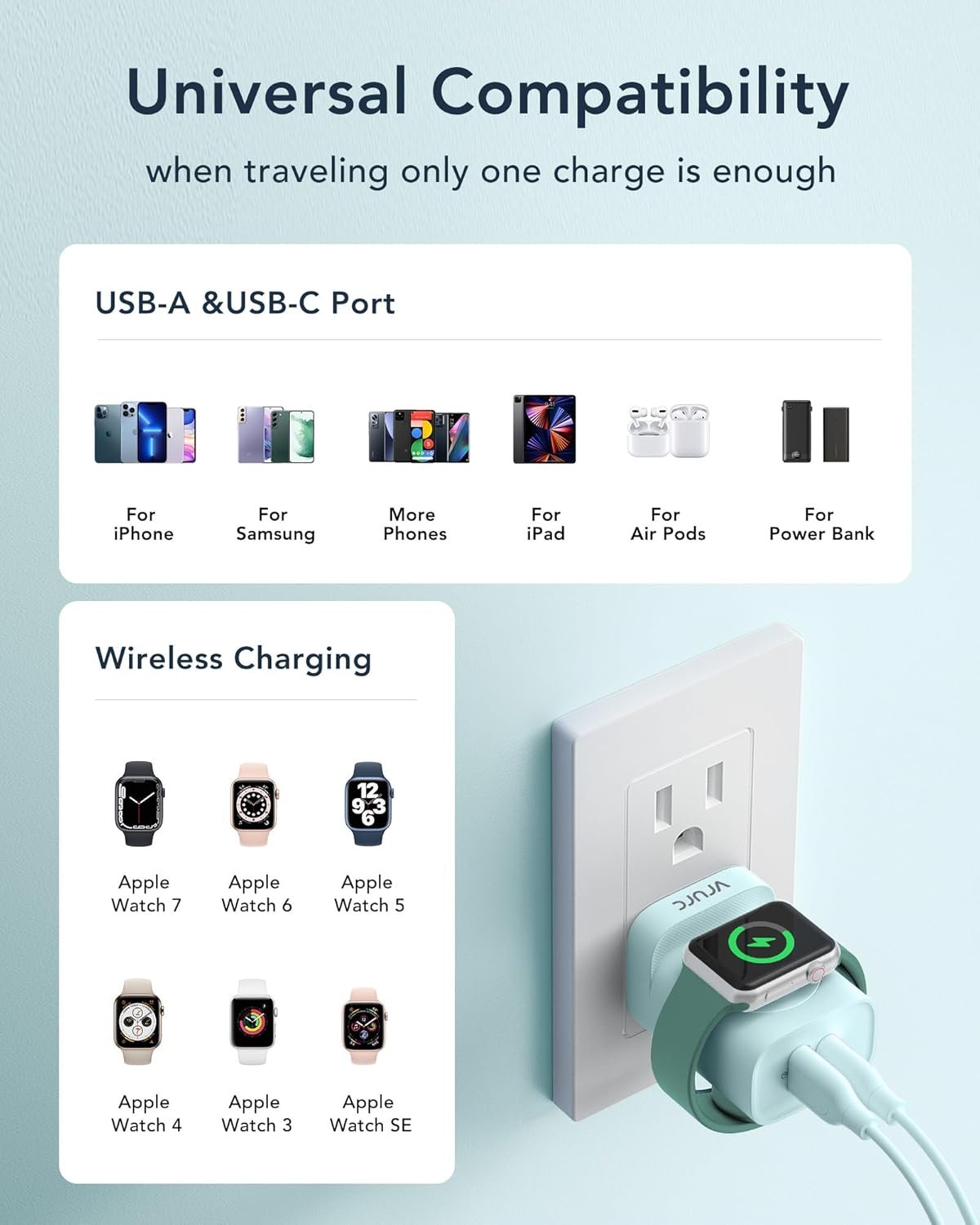 ⌚【Wireless Charger for Apple Watch】This small charger equipped with a magnetic wireless charger stand, one step charger for your iWatch, no extra cables needed. compatible with Apple Watch Ultra SE/11/10/9/8/7/6/5/4 series, perfect for travel charging block.(wireless charger only support for Apple Watch series )